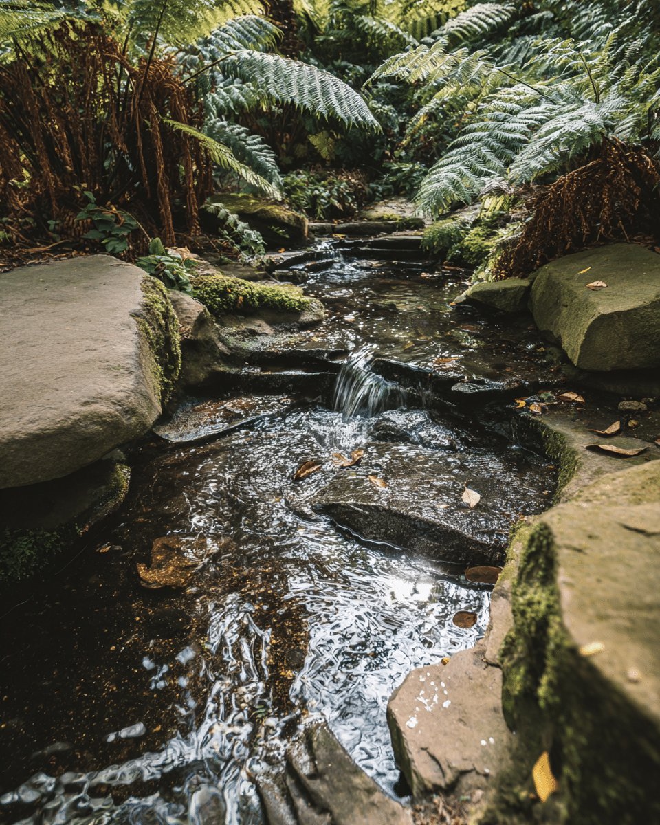 I love how this garden stream reads like a quiet secret in the yard. Layered ferns arch over a shallow, stone-lined cascade while moss knits the rocks together and tiny falls send sparkles across the surface.