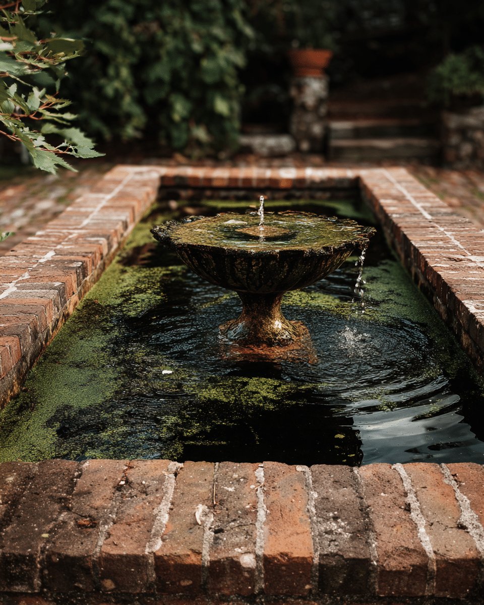I love the sleepy, secret-courtyard energy of this brick-lined water feature. The weathered pedestal bowl sits like a small stage, sending gentle streams and soft ripples across a bed of duckweed and moss.