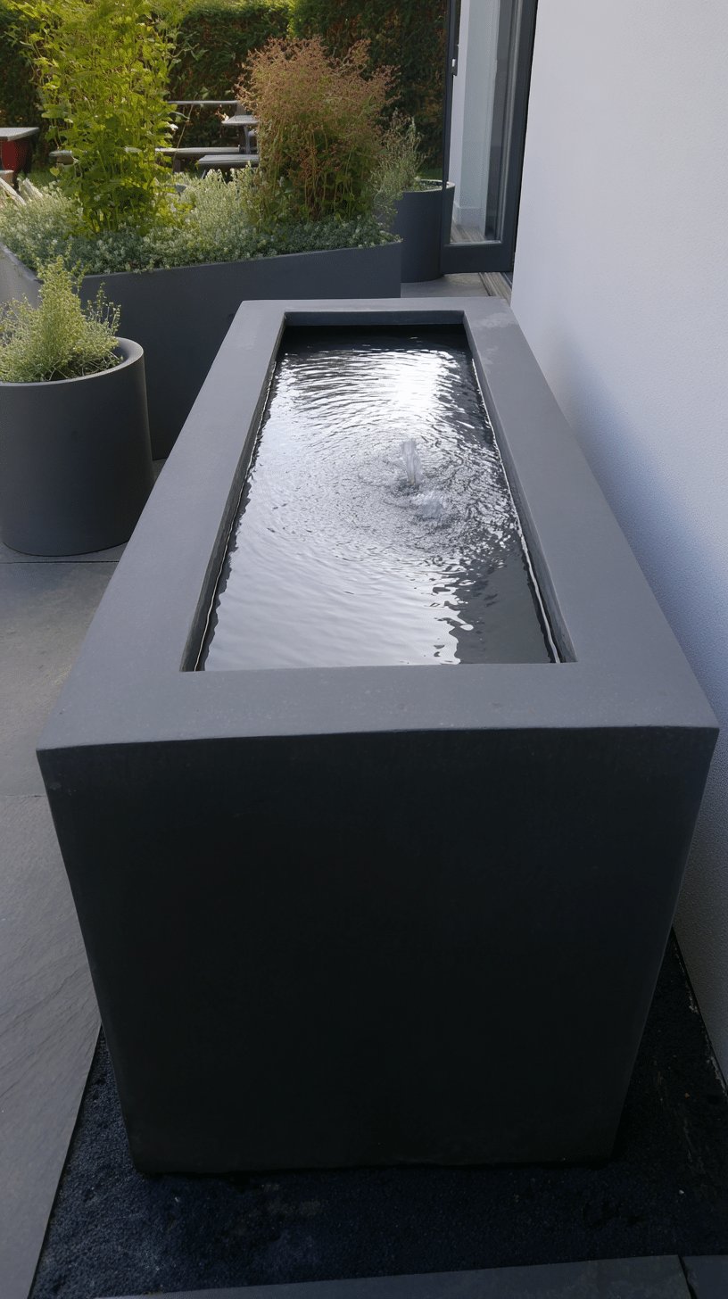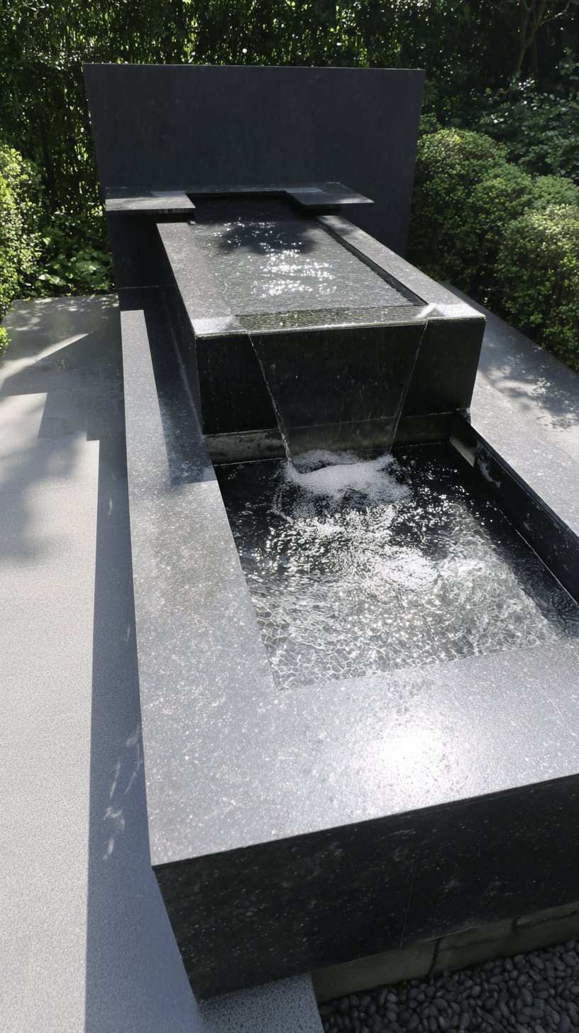 I love how this sleek black stone fountain reads like a private little spa. The long rectangular basin and crisp spillway make the water feel controlled but alive, catching the light in tiny stars as it trickles down.