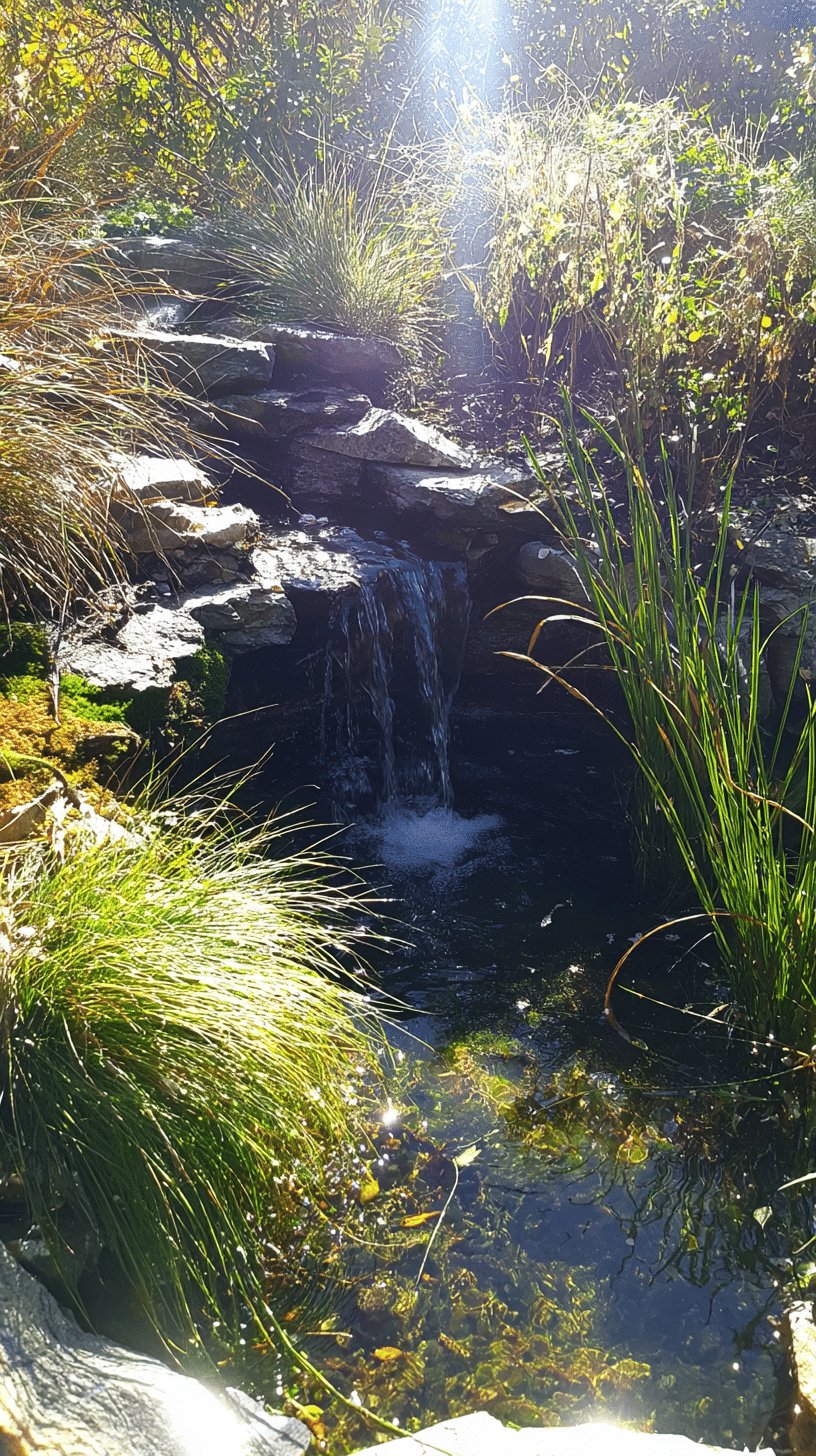 I love the way the little cascade tumbles over weathered boulders into a shallow, pebbled pool. The sun hits the water and turns every ripple into glitter, while moss on the rocks and clumps of rushy grasses soften the hard edges and make the whole thing feel lived-in.