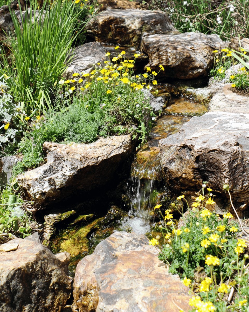 Style it simply to keep the charm: a weathered bench or two folding chairs, terracotta pots with marsh-loving plants, and a low groundcover spilling over the stones, like creeping thyme.