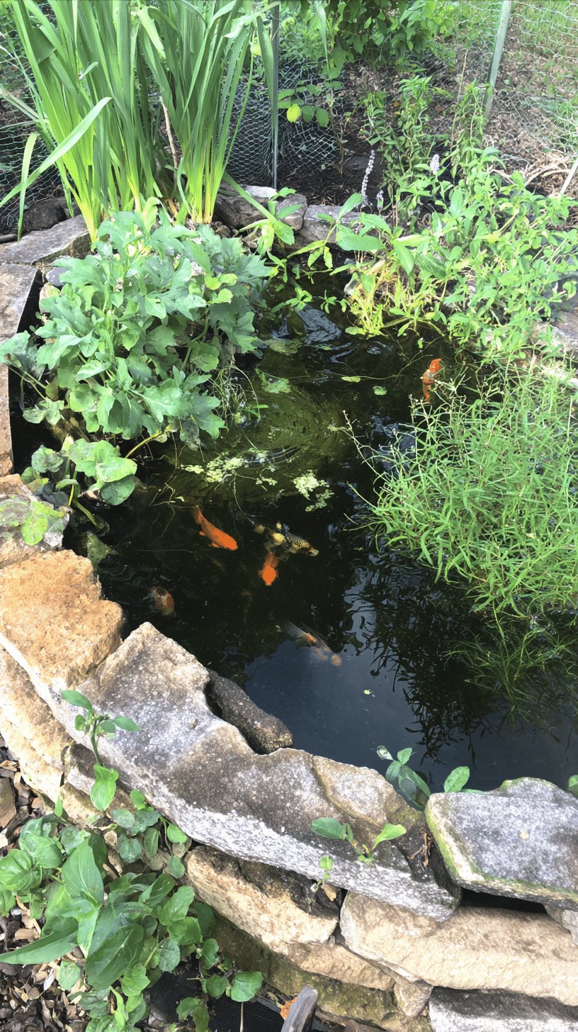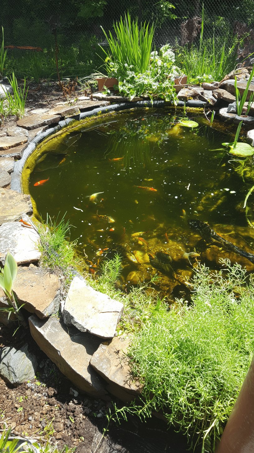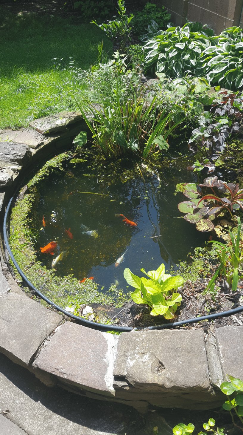 Tall marginal plants and a few potted greens soften the rim, and floating lily pads add a dreamy mirror effect. It has that slightly wild, much-loved energy — a little algae, lots of personality, and the kind of calm you get from watching fish do their slow, judgment-free thing.