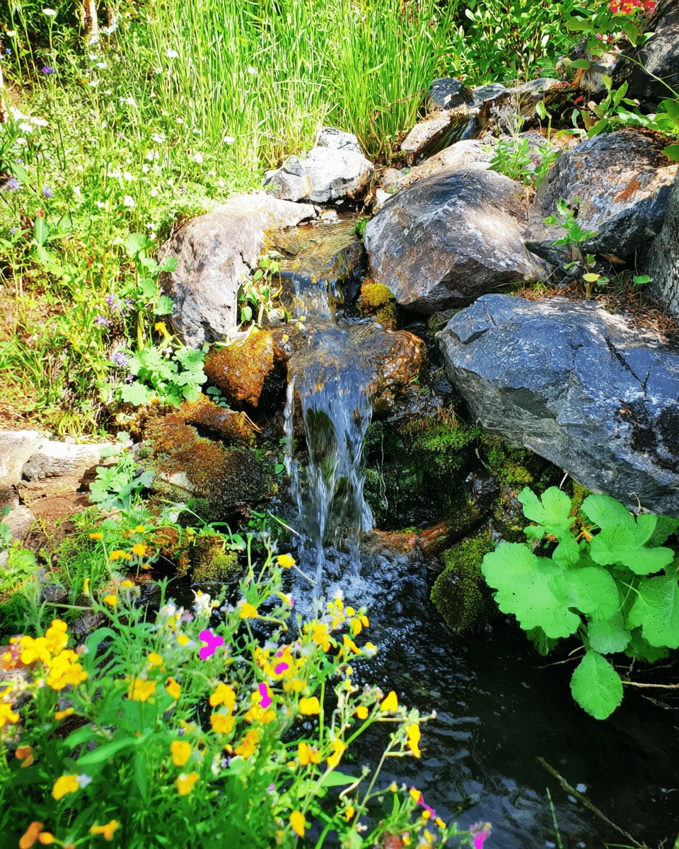 I love the secret-garden energy of this little waterfall. Natural boulders cradle the flow, moss softens the edges, and a tumble of moisture-loving foliage plus those poppy yellow and pink blooms make the whole spot feel cheerful without trying too hard.