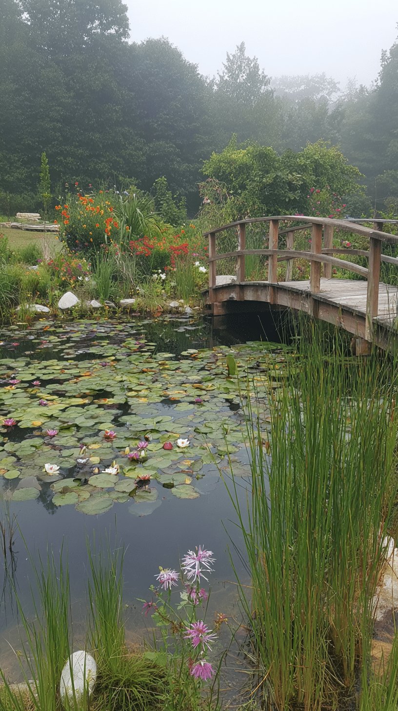Add terracotta pots with marginal plants or herbs near the edge, and let a few cottage-y flowers tumble toward the water for a lived-in look. Keep accessories minimal so the lilies and the bridge do the heavy lifting.