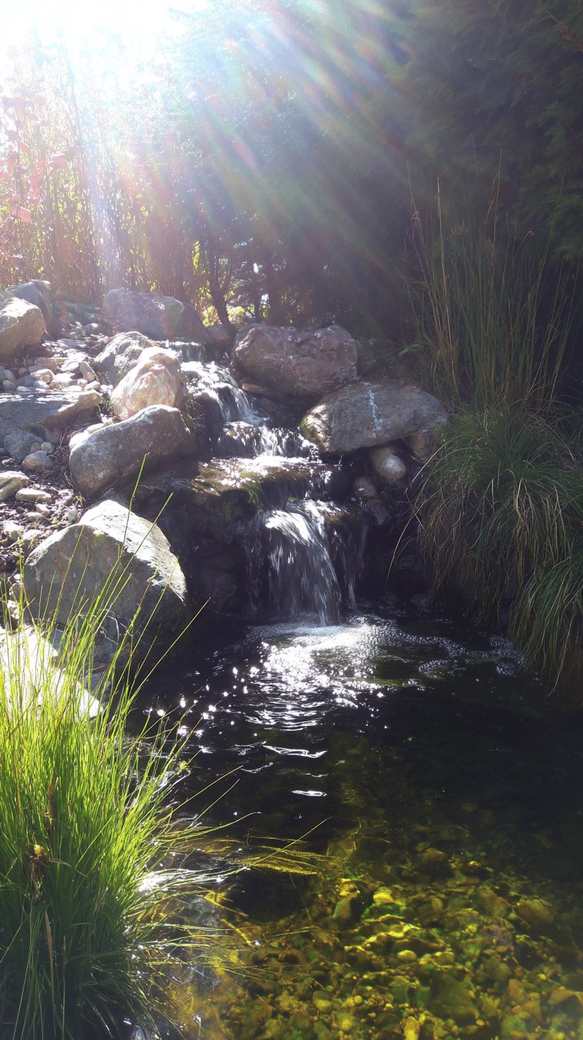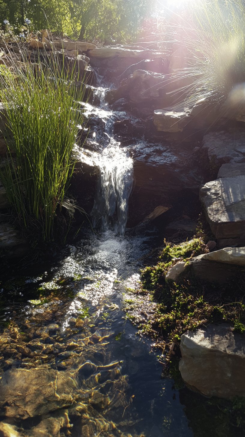 I love how this little cascade reads like a secret stream you tripped over on purpose. Water tumbles over layered flagstone into a shallow, sun-speckled pool and every ripple catches light like tiny confetti.