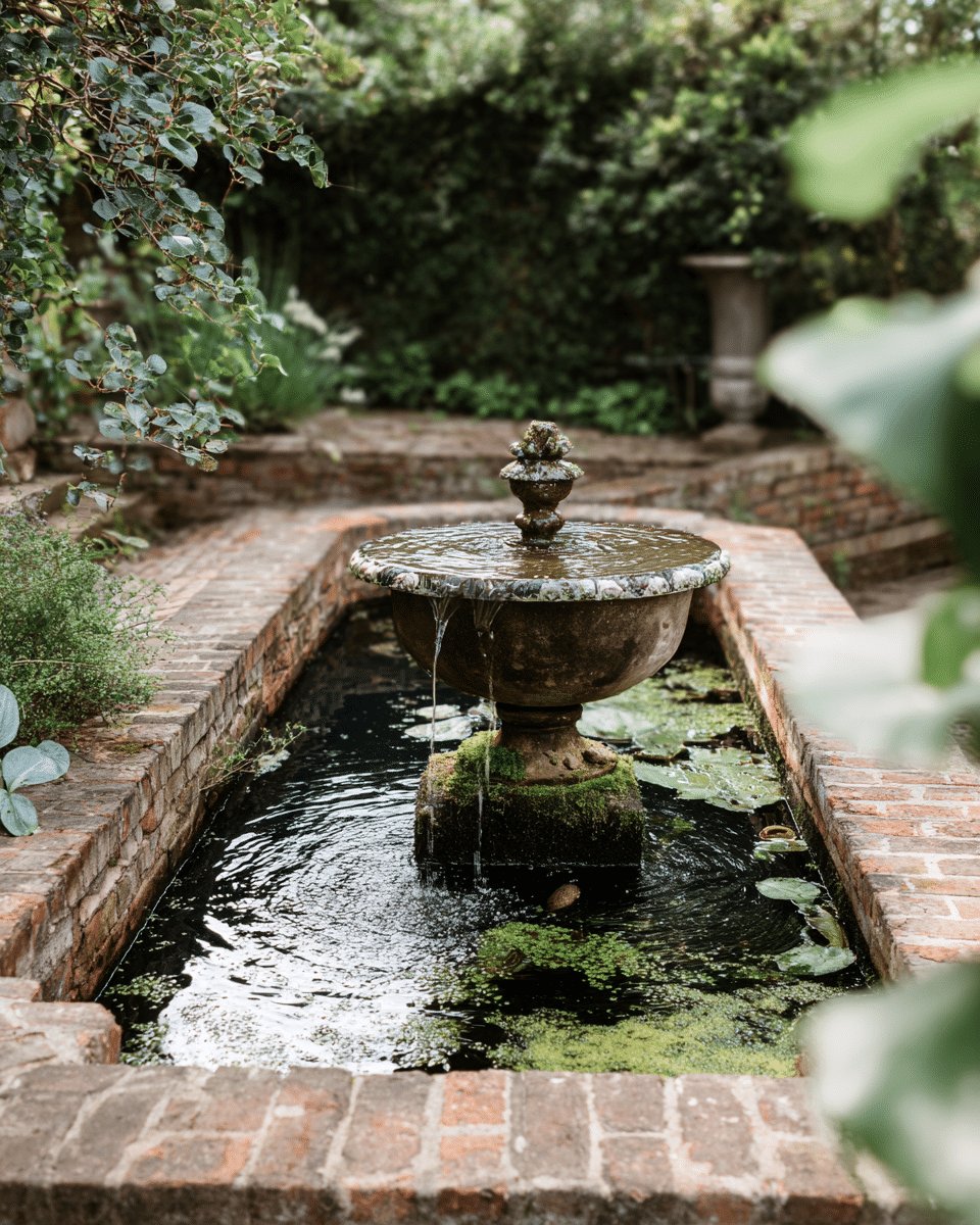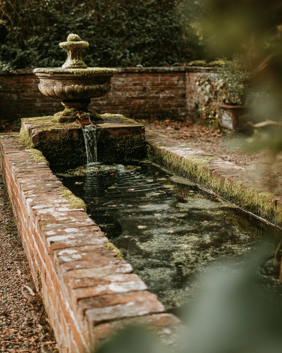 I love the secret-garden mood of the moss-covered stone fountain and the long brick trough. The weathered urn and soft green patina make it feel like a place with history. Water trickles into a narrow reflective channel, catching leaves and tiny ripples that calm the whole space.