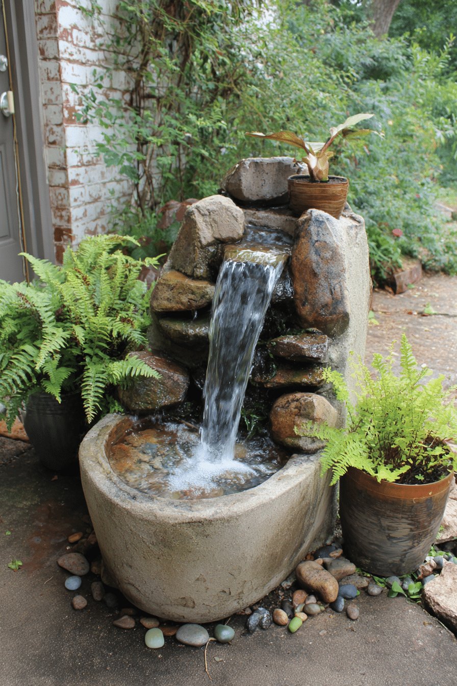 Potted ferns on either side and a carpet of low groundcover soften the hard edges and make the whole corner feel lush without trying. The gentle sound of running water turns a patio into a tiny sanctuary, the kind you actually want to linger in.