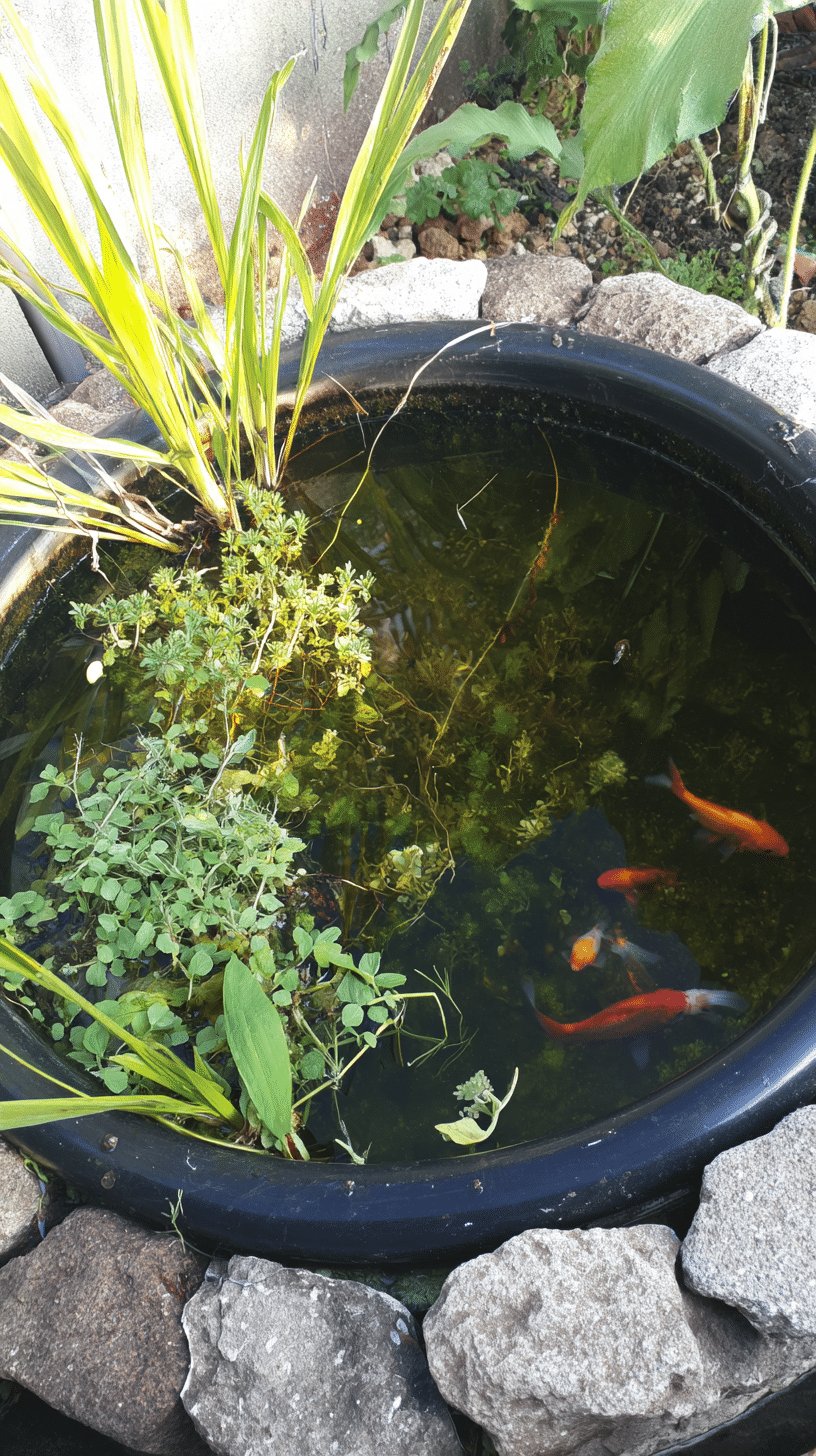 I love how this little container pond reads like a secret oasis you tripped over in the best way. The black tub set into a ring of rough stones feels honest and low fuss, while the orange goldfish bring motion and a bit of showbiz.