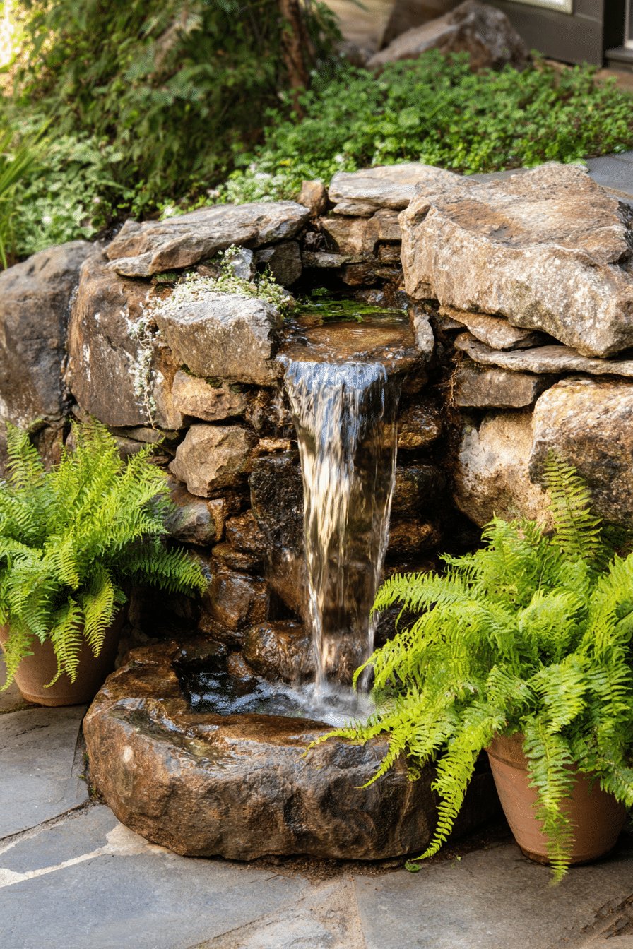 I love how this little rock cascade reads like a tiny, private stream that wandered into the garden and decided to stay. The water threading over rough stone brings instant calm, while moss and low groundcovers tuck into every crevice for that perfectly lived-in look.