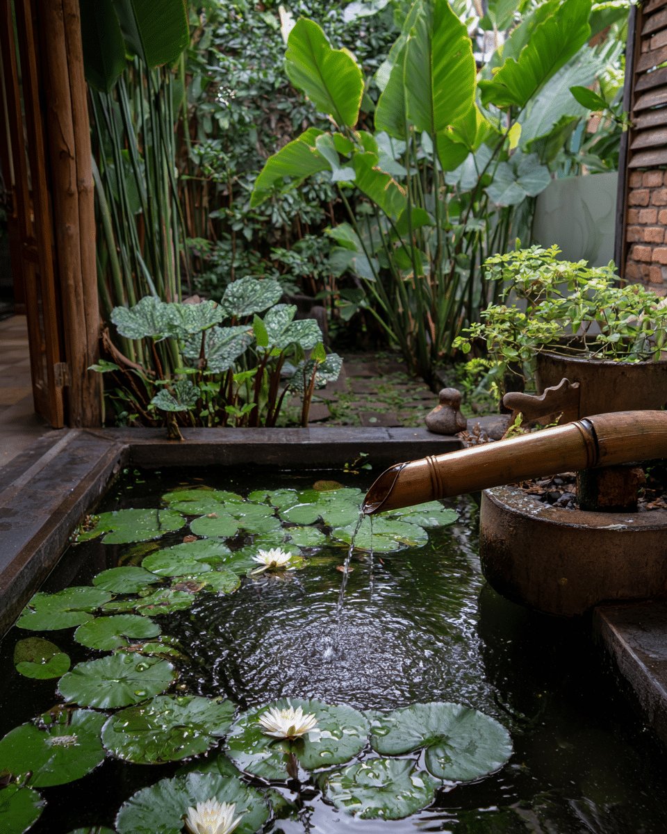 I love the hush this water feature brings. A bamboo spout sends a quiet arc of water into a shallow rectangular pond ringed with stone and aged brick, and the ripples make everything feel pleasantly alive.