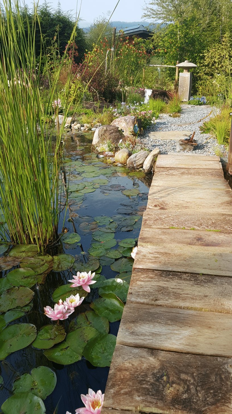 I love the laid-back pond-side charm here. The weathered plank walkway begs for slow steps, and the pink water lilies floating on glossy pads are the kind of detail that makes you stop and grin.