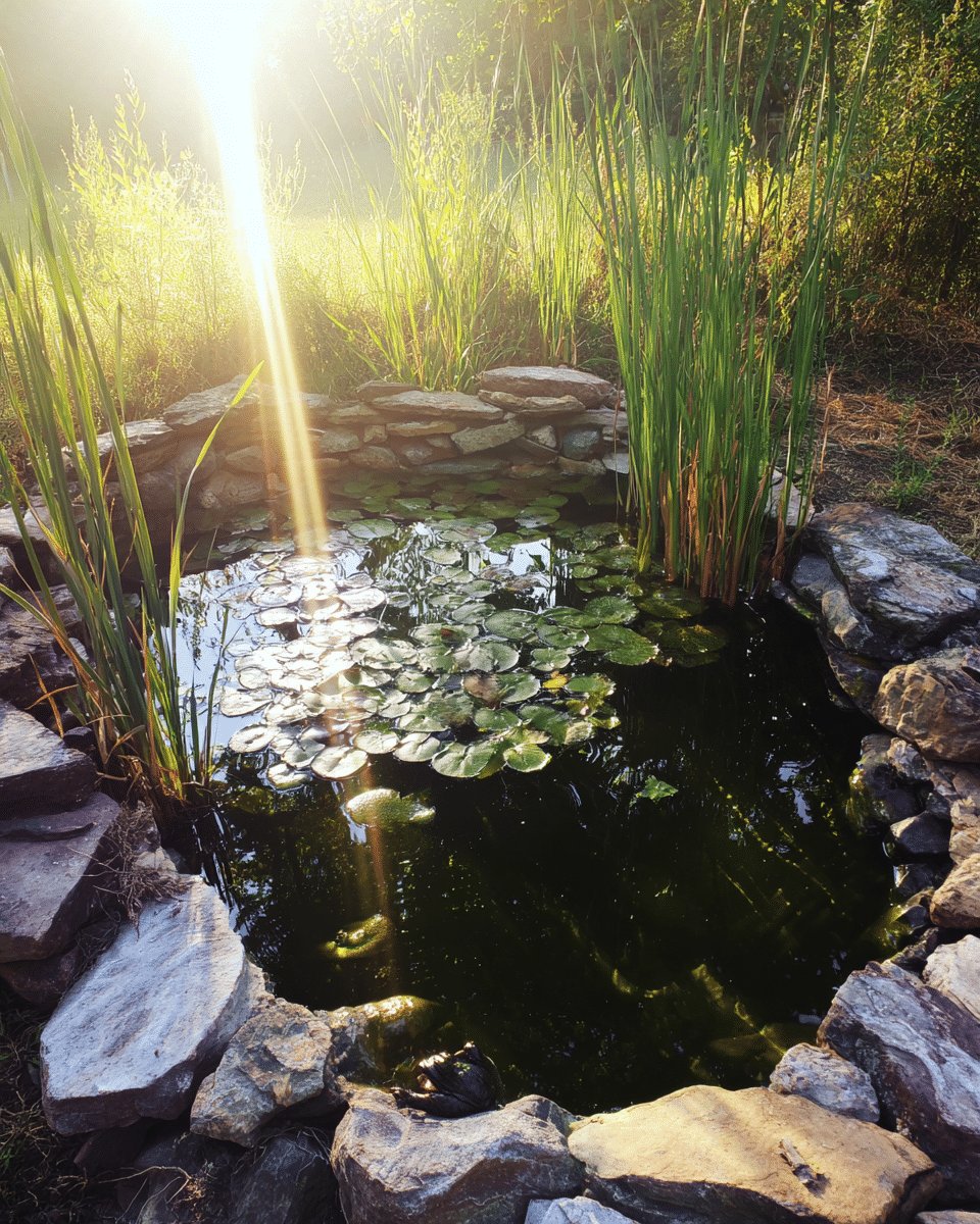 I love the lazy, secret-garden vibe of this small pond. The rough stone edging feels handmade and anchors the water, while flat lily pads and tall, reed-like grasses push up through the surface for a wild, lived-in look; sunlight streaking across the water makes everything feel a little magical, and that tiny frog on the rock is the kind of charming detail that makes me smile every time.