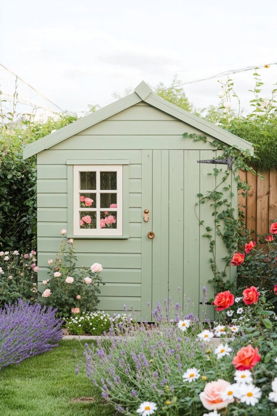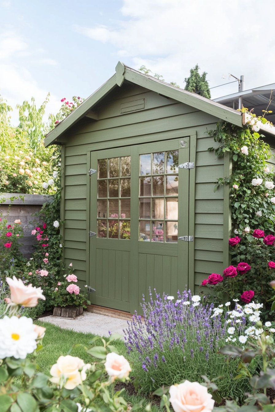 I adore this charming garden shed surrounded by a vibrant mix of roses and lavender. The soft green color of the shed beautifully complements the lush floral display.