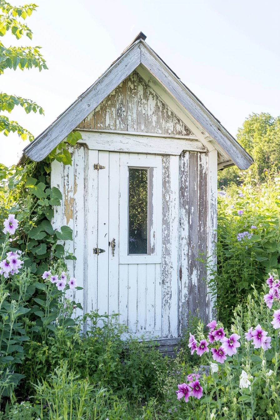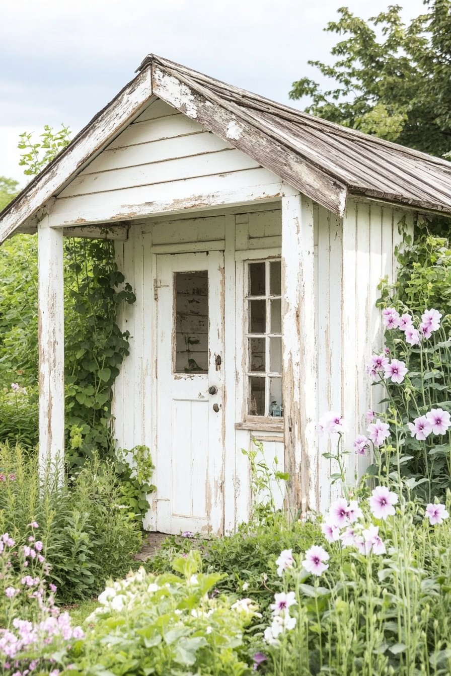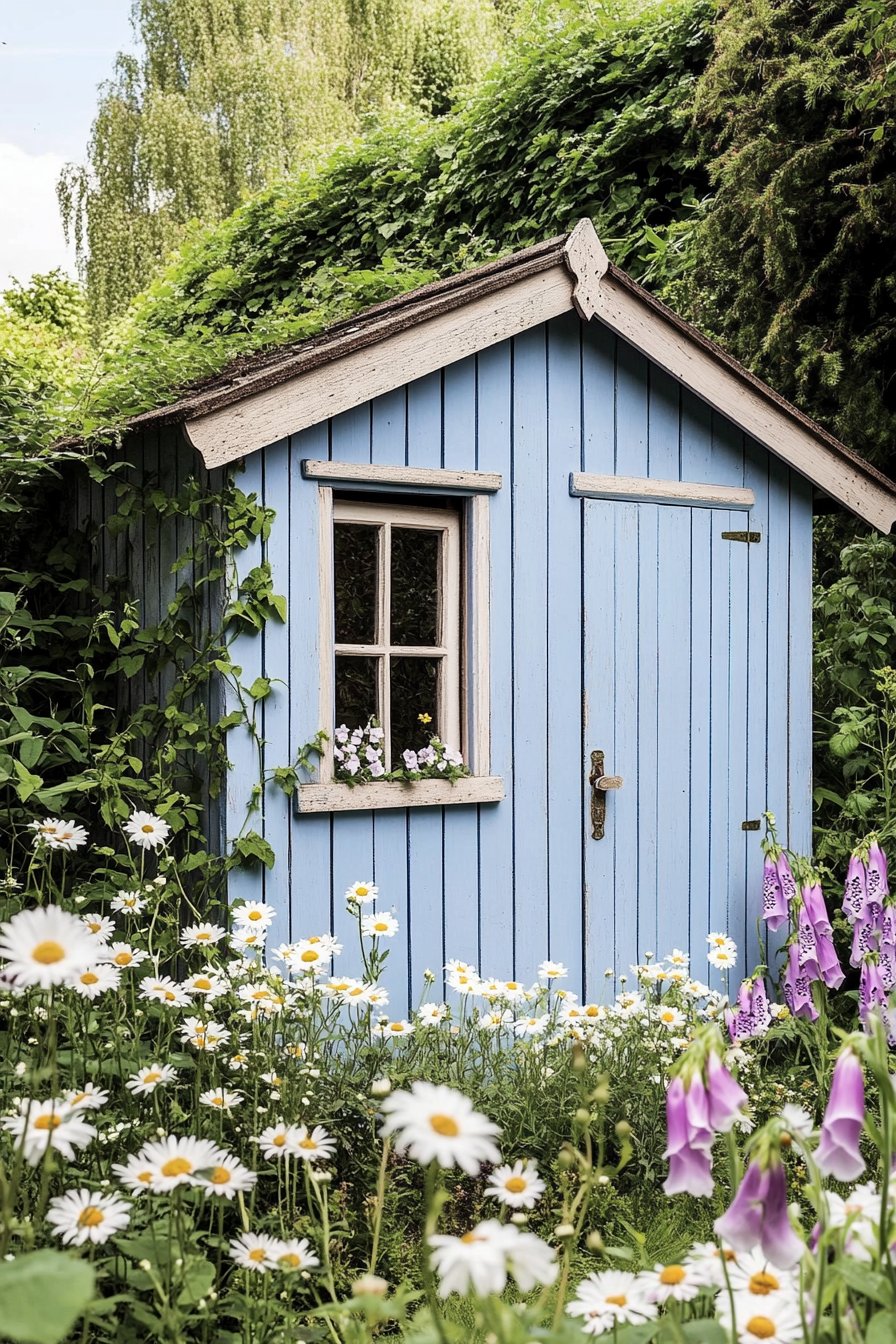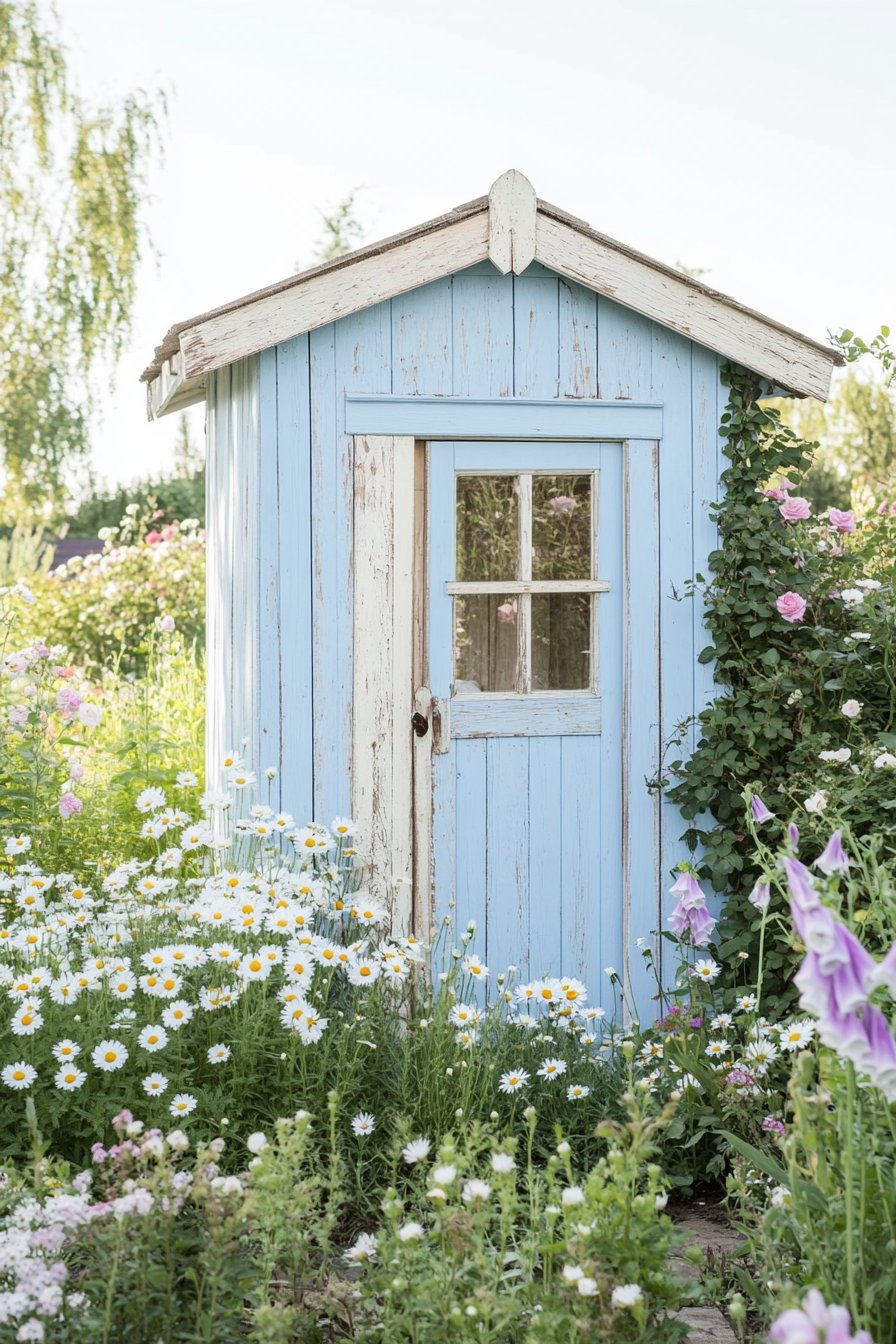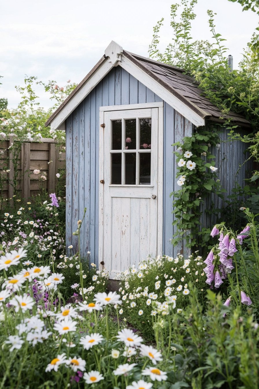 To achieve a similar look, choose soft pastel colors for your shed and plant an abundance of wildflowers around it. Incorporating climbing plants will add a lush, inviting feel to your garden space.