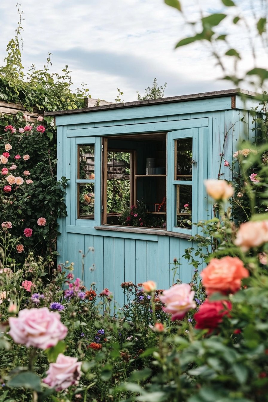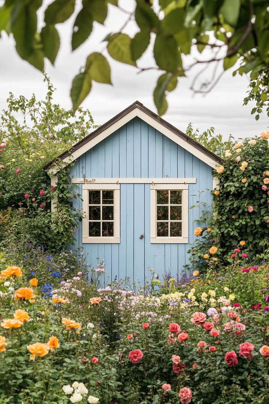 This design showcases a delightful blue garden shed surrounded by a lush array of colorful roses and wildflowers. To achieve a similar look, incorporate vibrant hues in your structures and plant a diverse selection of blooms for a lively atmosphere.