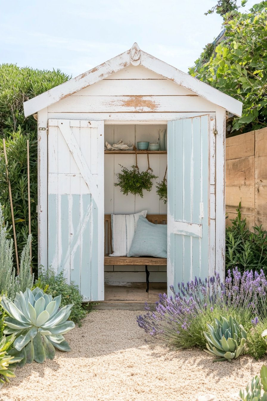 This design showcases a charming, coastal-inspired garden shed, adorned with a soft blue door. The surrounding lavender and succulent plantings create a serene and inviting atmosphere.