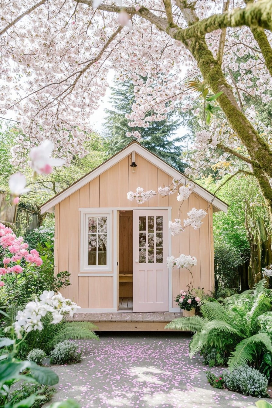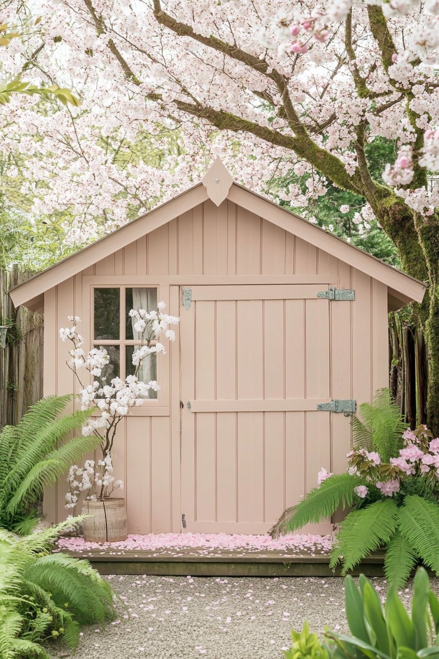 This design captures a tranquil garden vibe with a charming pink shed nestled among delicate cherry blossoms. Lush ferns and scattered petals create a harmonious and inviting space.