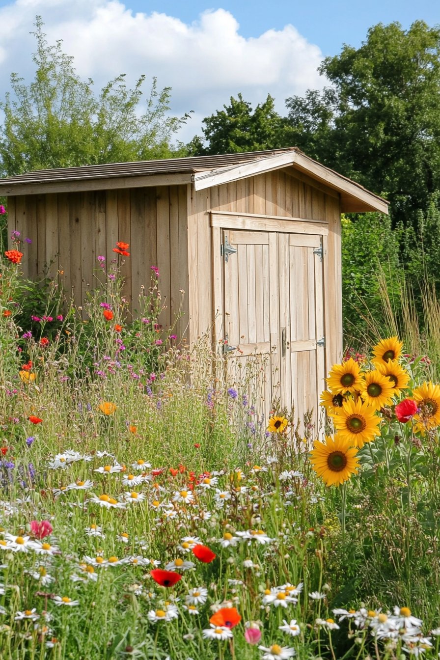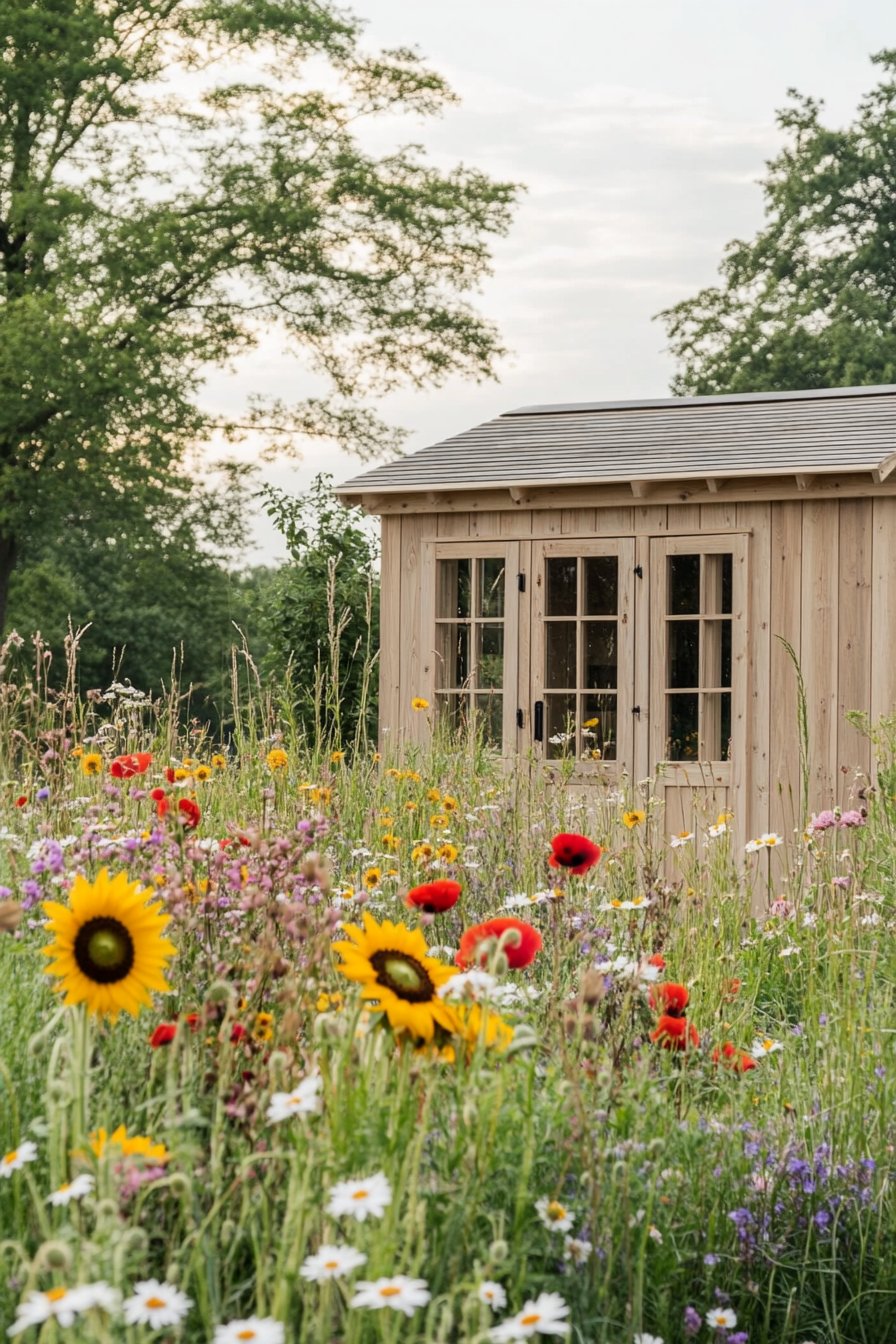 This design features a charming wooden shed surrounded by a riot of colorful wildflowers, including and poppies. The natural, relaxed vibe invites a sense of tranquility and connection with nature.