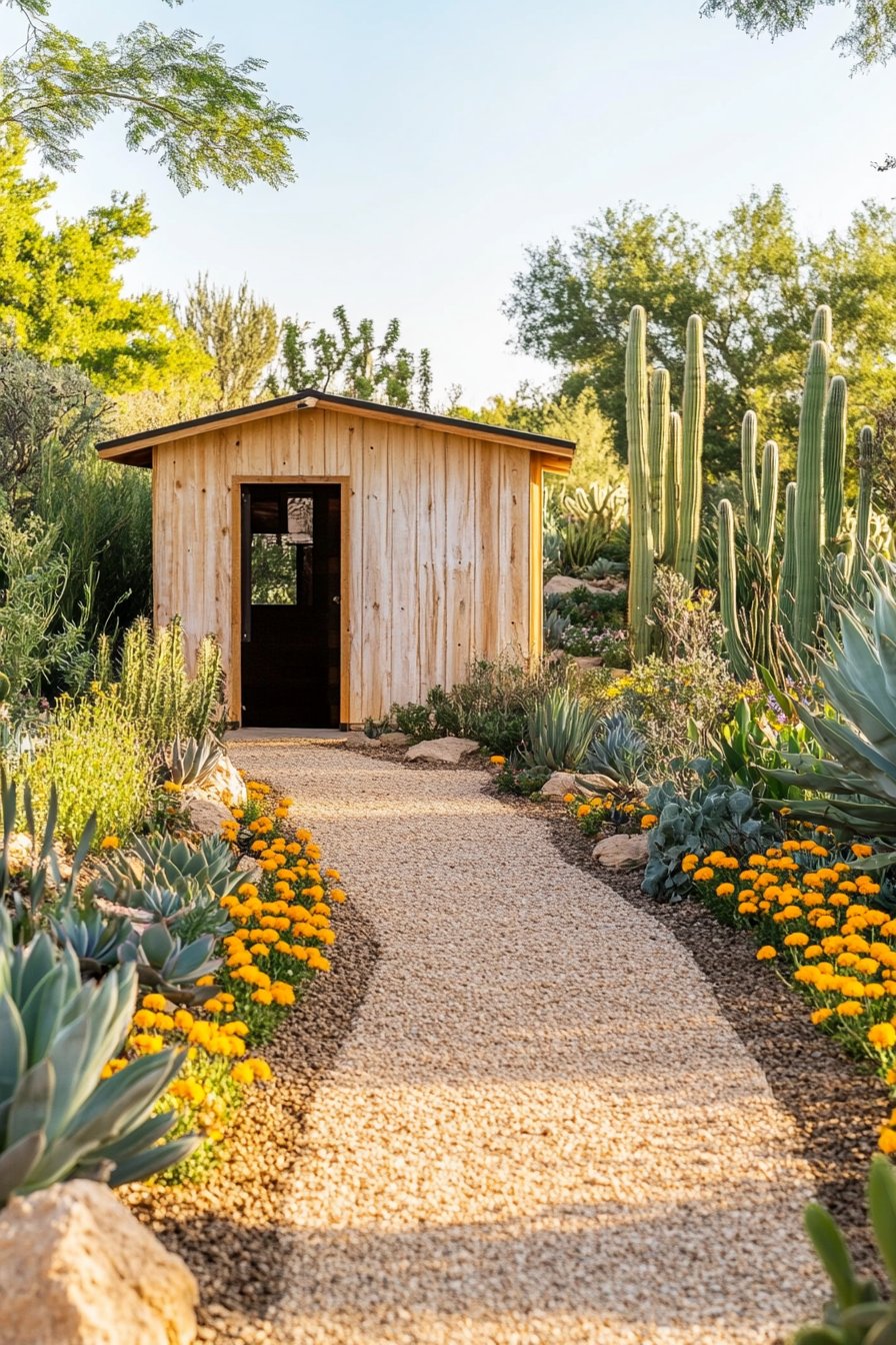 This design showcases a harmonious blend of natural elements with a stunning wooden shed as a focal point. The vibrant marigolds and diverse succulents create a colorful and inviting pathway.
