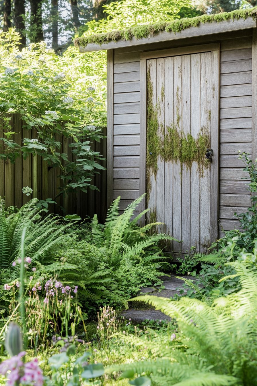Adding a rustic wooden path can enhance the organic feel, while ensuring the shed blends harmoniously with the natural surroundings. Emphasizing varying shades of green and subtle pops of color will create a tranquil retreat.