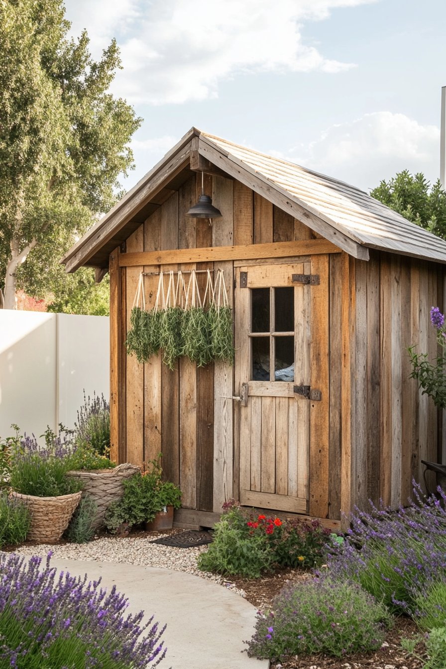 This design beautifully blends rustic elements with vibrant plant life. The warm wood tones of the shed complement the lush greenery and colorful blooms surrounding it.