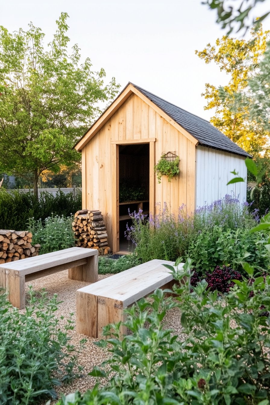 This design beautifully combines natural materials and vibrant planting to create a serene outdoor space. The warm wooden shed and rustic benches invite relaxation amidst lush greenery.