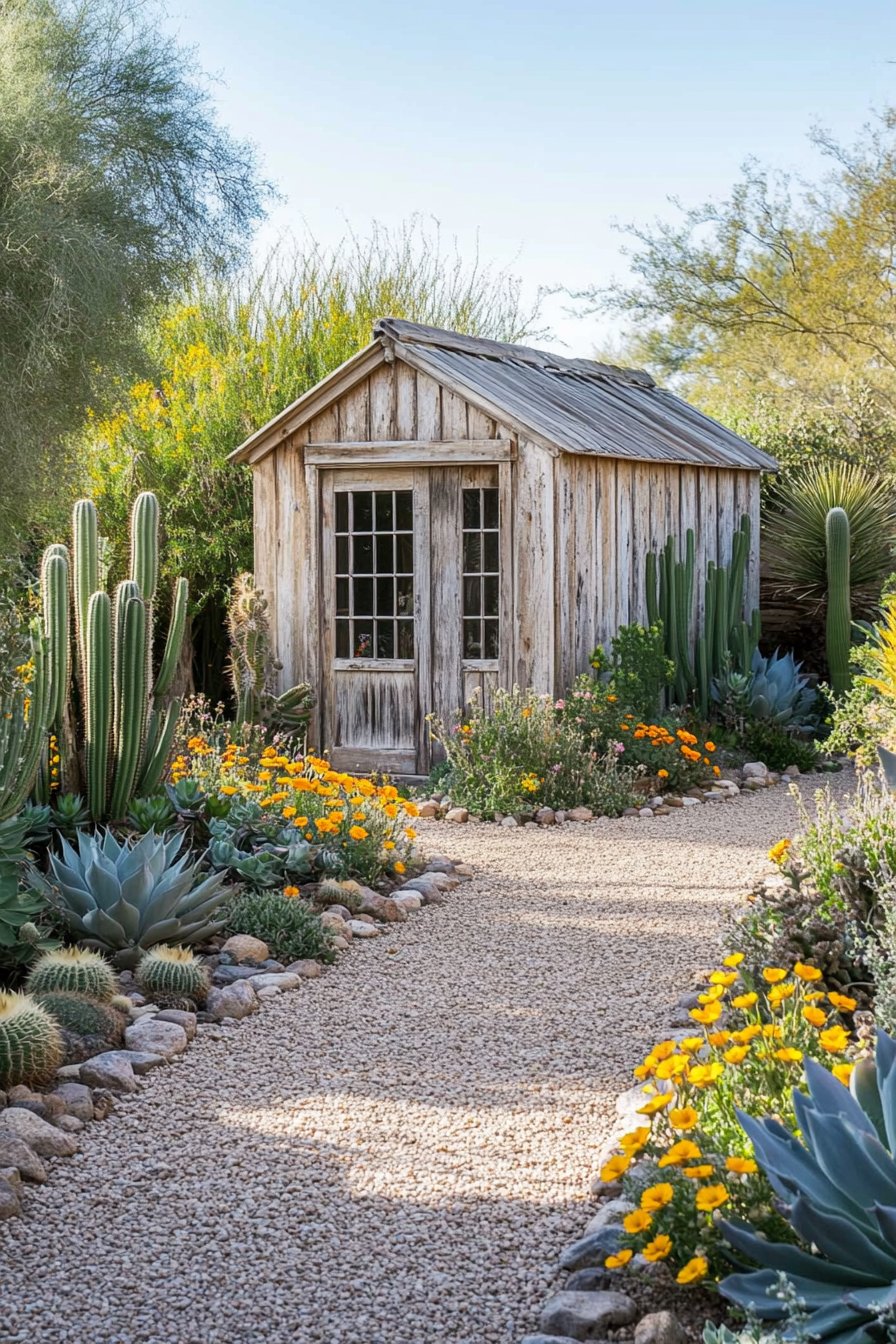 This garden design captivates me with its rustic wooden shed and vibrant bursts of color from the flowers. The combination of succulents, cacti, and a pebbled pathway creates a serene yet lively atmosphere.