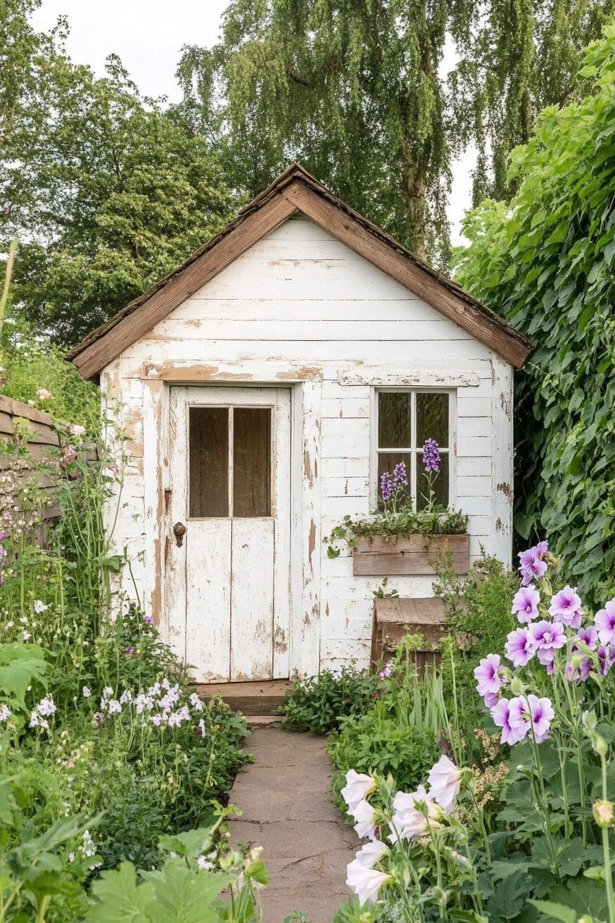 To achieve a similar look, incorporate a garden shed painted in soothing colors and surround it with a mix of perennial flowers. Layering plants of varying heights will add depth and interest to your space.