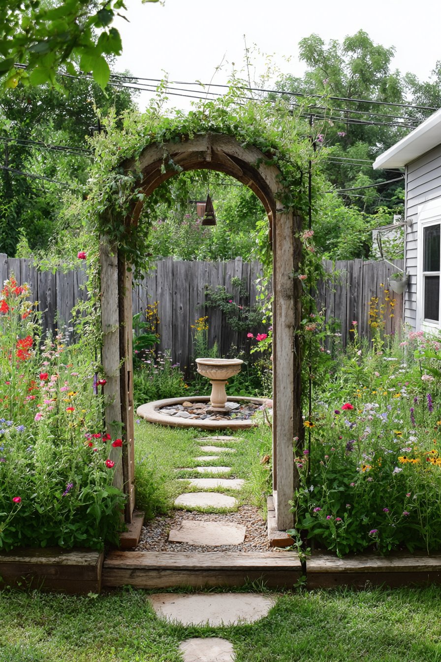 A rustic wooden archway draped with climbing vines invites you into a vibrant tapestry of wildflowers, featuring pops of color from zinnias and cosmos. To replicate this enchanting look, incorporate a mix of perennials and annuals, and consider adding a charming water feature to enhance tranquility.