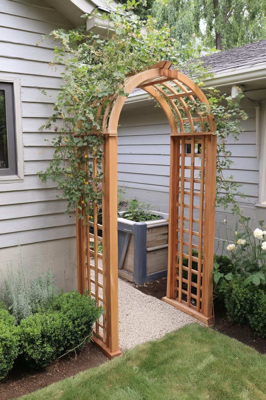 A rustic wooden archway draped in fragrant climbing vines creates a charming focal point, inviting visitors to explore the lush greenery beyond. For a similar effect, consider planting star jasmine or clematis to achieve vibrant blooms and delightful scents.