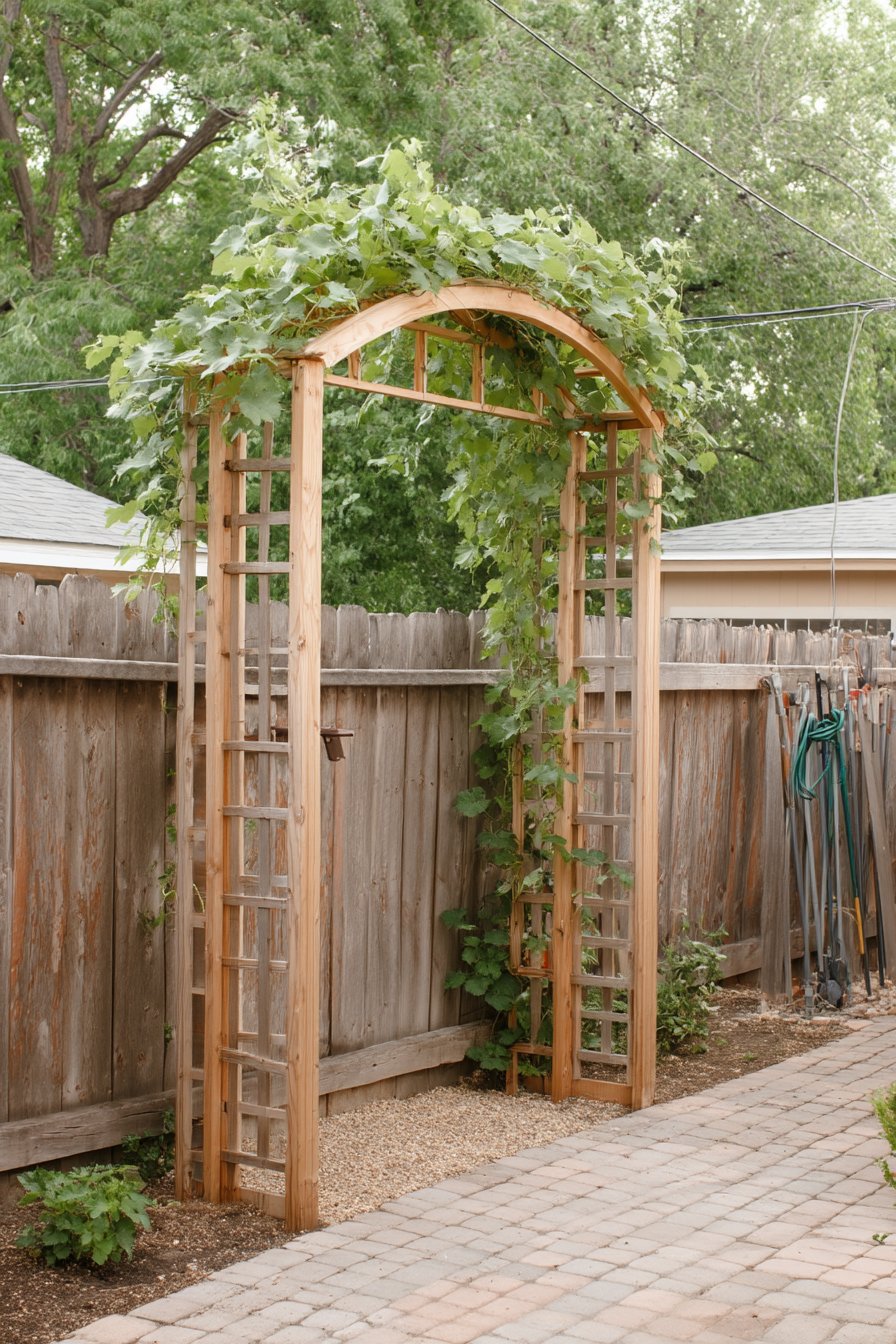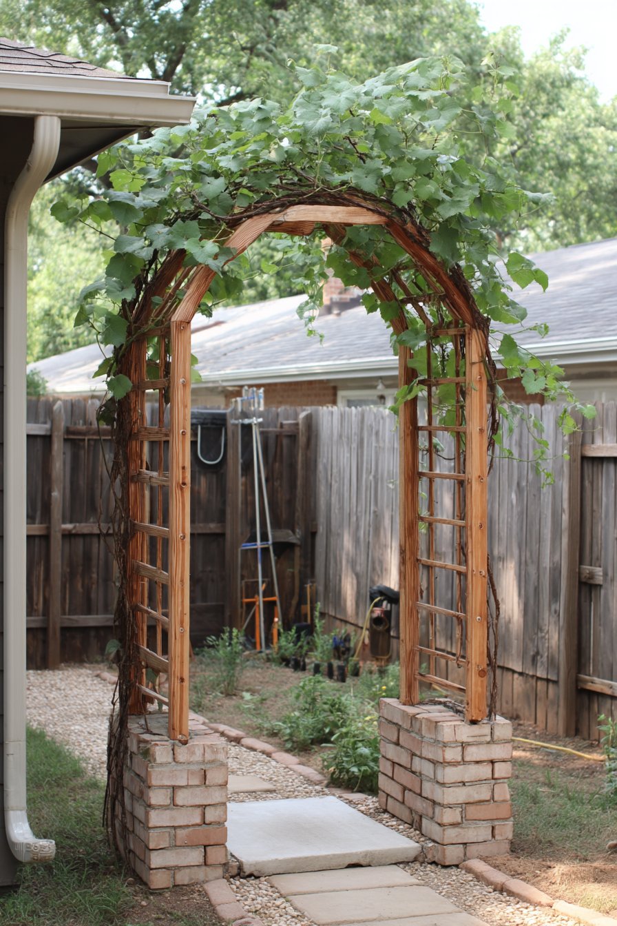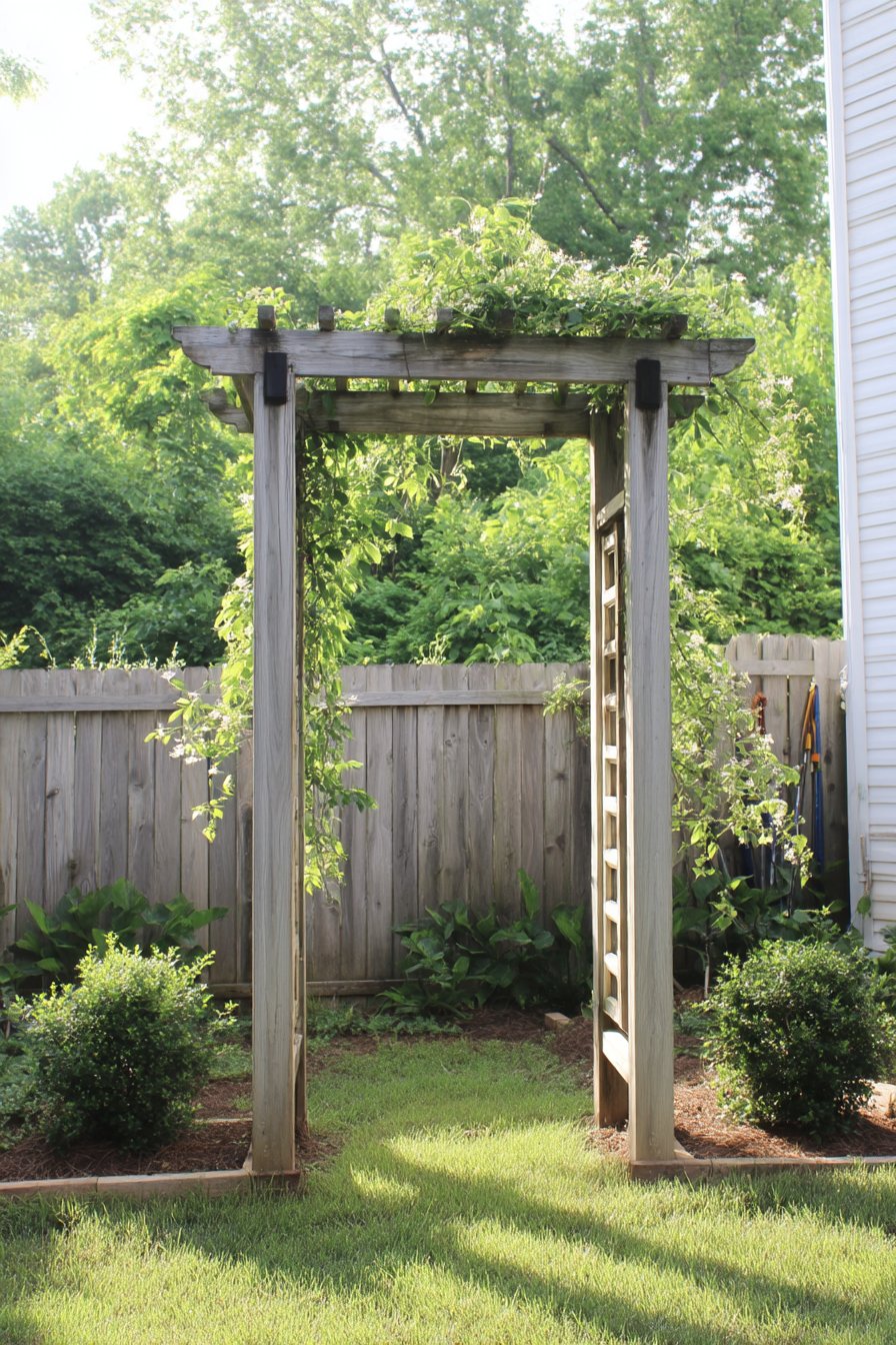 A rustic wooden archway adorned with lush vines creates a charming focal point, inviting a sense of serenity and natural beauty. To replicate this look, consider using grapevines or climbing roses, and ensure your structure is sturdy enough to support their growth.