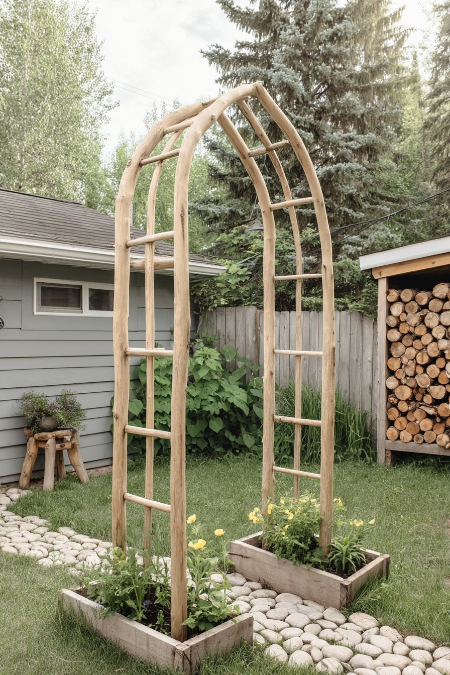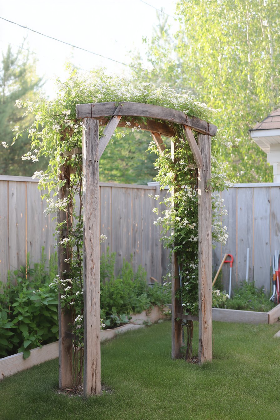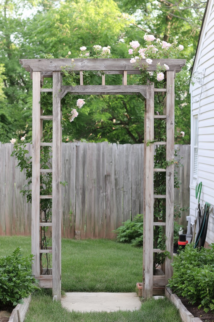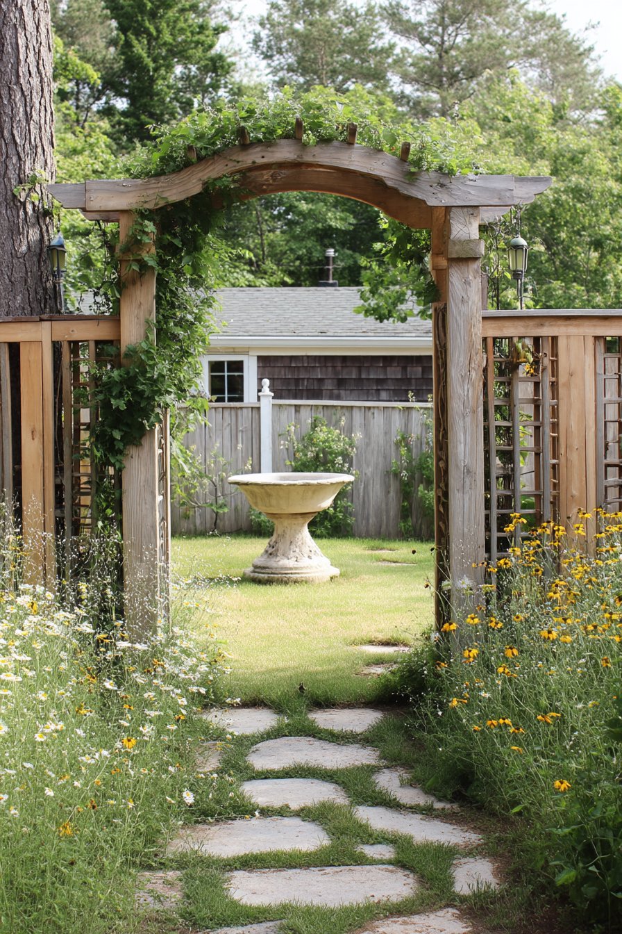 A rustic wooden archway adorned with lush vines creates a charming focal point, inviting a sense of serenity and natural beauty. To replicate this look, consider using grapevines or climbing roses, and ensure your structure is sturdy enough to support their growth.