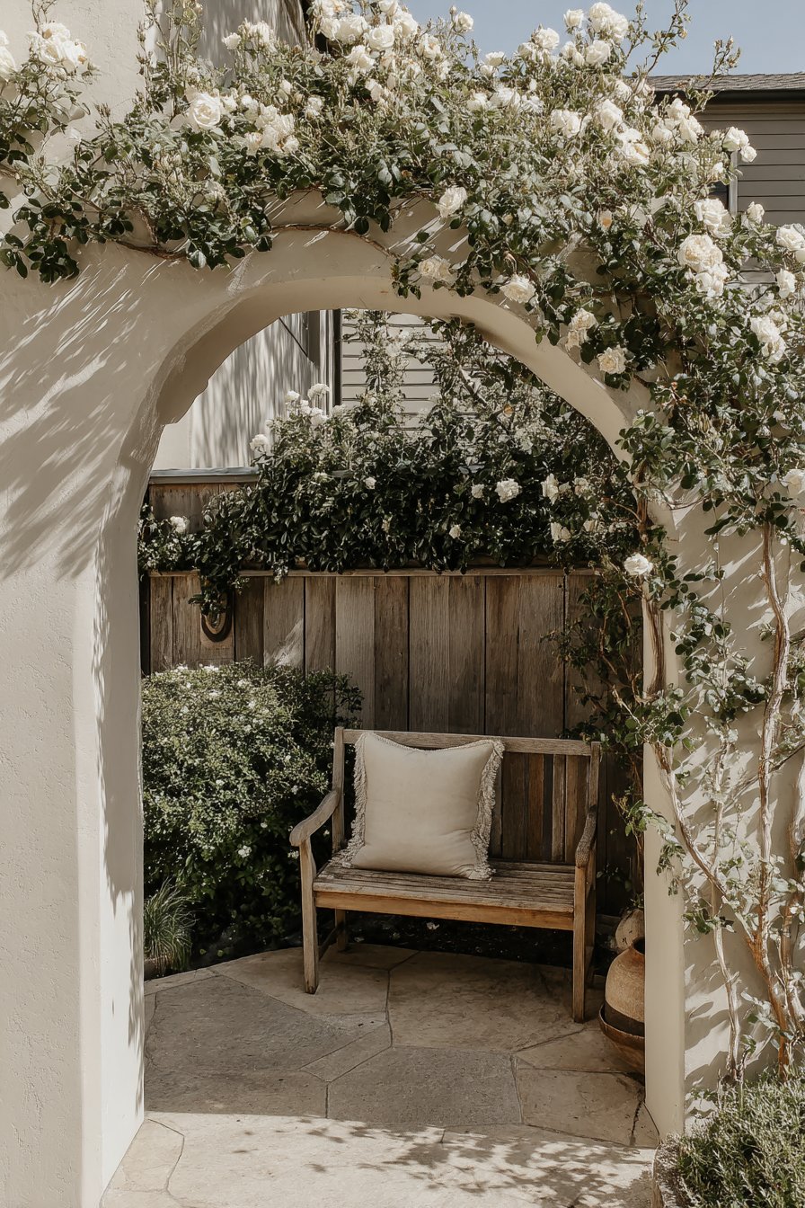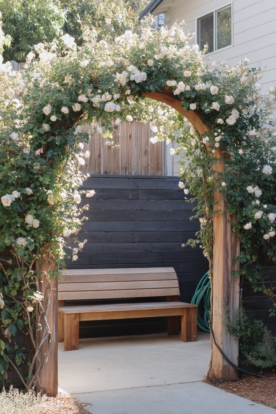 The graceful archway adorned with lush white roses creates a stunning focal point, inviting tranquility and elegance into any garden space. To replicate this look, choose climbing roses and pair them with a rustic wooden bench for a serene seating area.