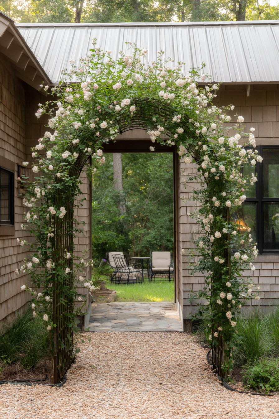 The rustic wooden archway adorned with cascading white roses creates a stunning focal point, inviting tranquility and romance to any garden. To replicate this look, choose climbing roses and incorporate natural wood elements for an organic touch.