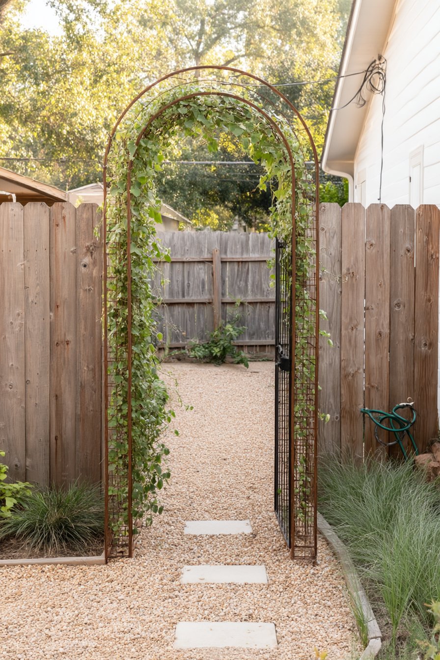 A charming archway draped in lush vines invites visitors into a serene space, blending rustic metal with vibrant greenery. To recreate this look, consider planting climbing plants like sweet peas or ivy around a sturdy trellis for a lush, welcoming entrance.