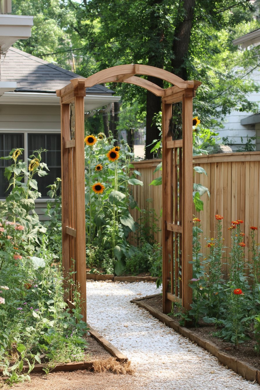 The rustic wooden archway beautifully frames vibrant sunflowers, creating an inviting focal point that draws the eye along the gravel path. To replicate this charming look, consider planting sunflowers alongside colorful annuals like zinnias or petunias for added texture and color.