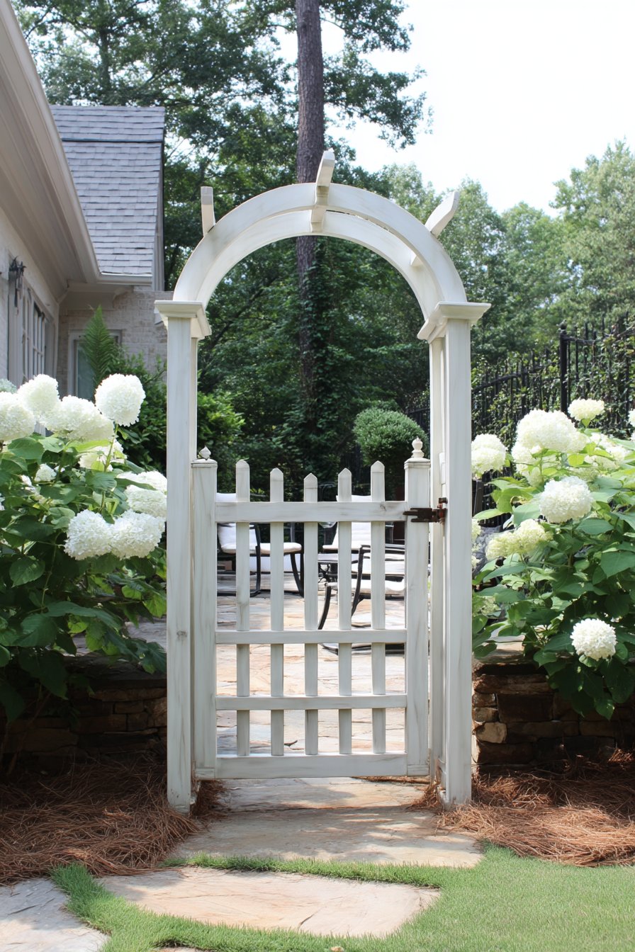 A stunning archway framed by lush white hydrangeas creates a serene entrance, inviting visitors into a tranquil garden space. To replicate this look, plant hydrangeas in well-draining soil and ensure they receive partial shade for optimal blooms.