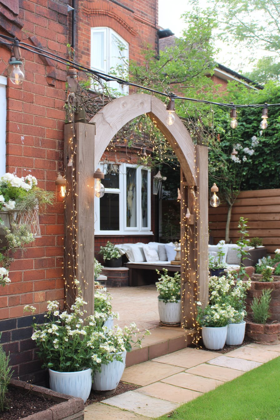 A charming wooden archway adorned with twinkling fairy lights creates a magical entrance, complemented by lush pots of white flowering plants like sweet alyssum. To replicate this enchanting look, use soft lighting and choose vibrant, seasonal blooms that thrive in your local climate for added texture and color.