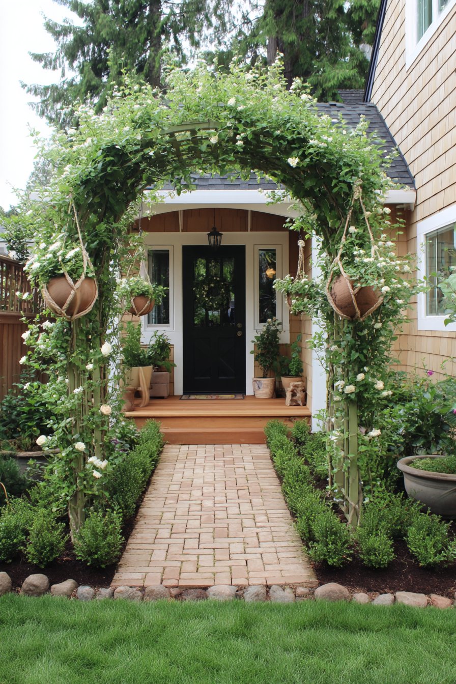 Create a welcoming entrance with a bamboo archway draped in climbing roses, adding lush greenery and a touch of elegance. Incorporate potted plants and low-maintenance boxwoods along the path for a neat, inviting look.