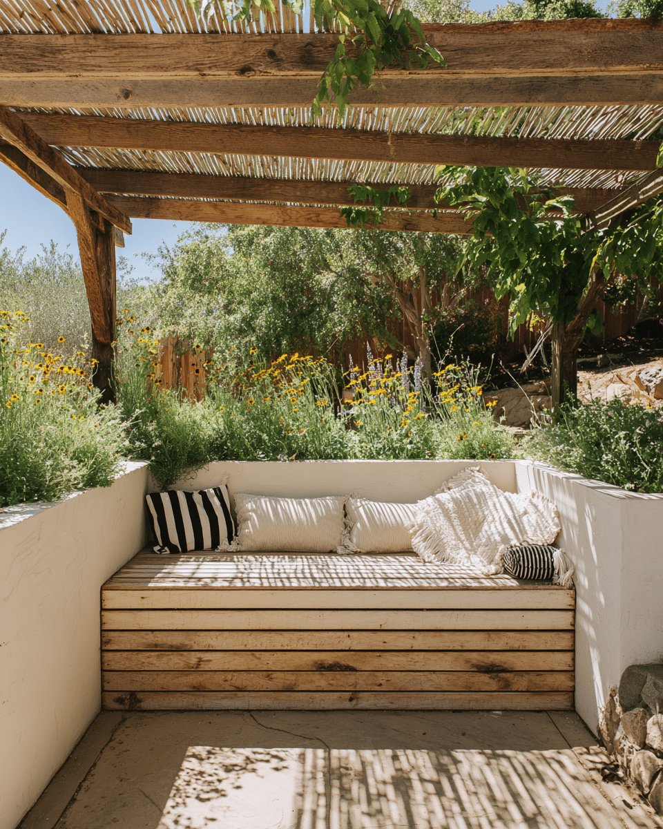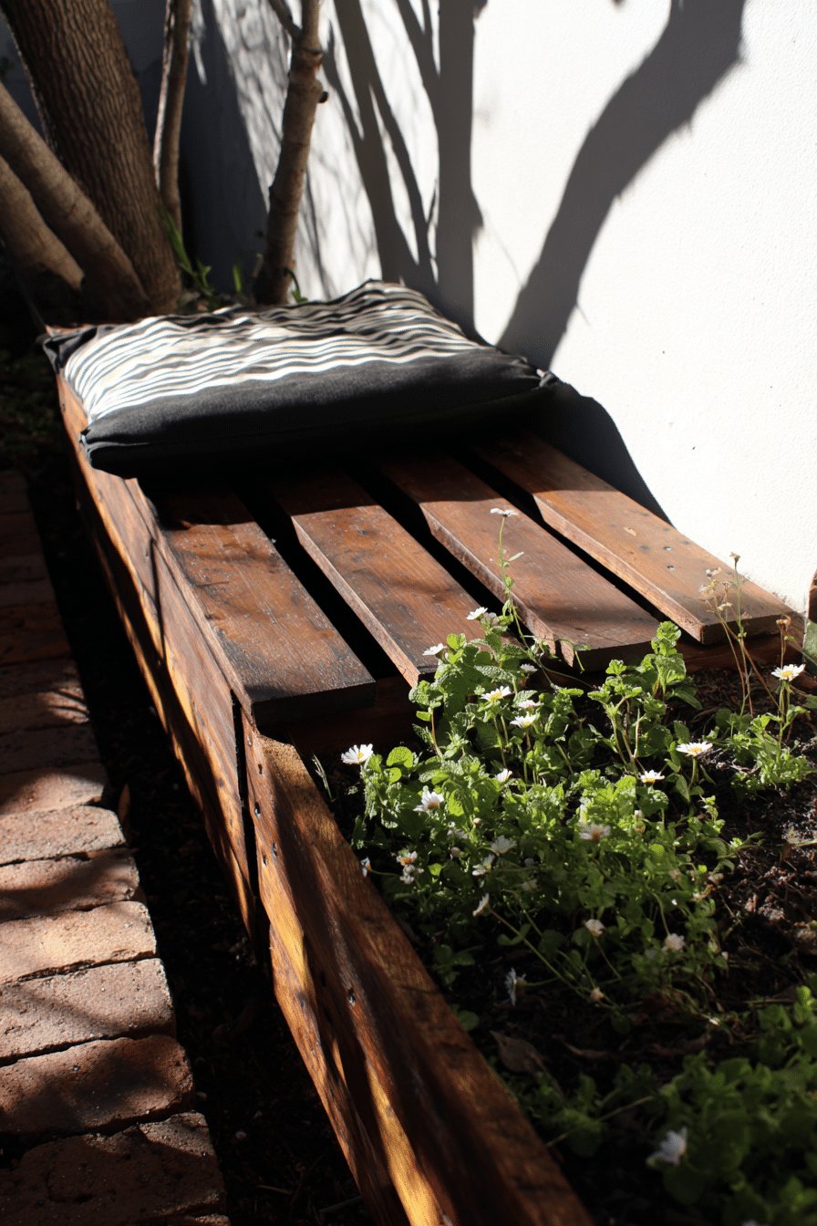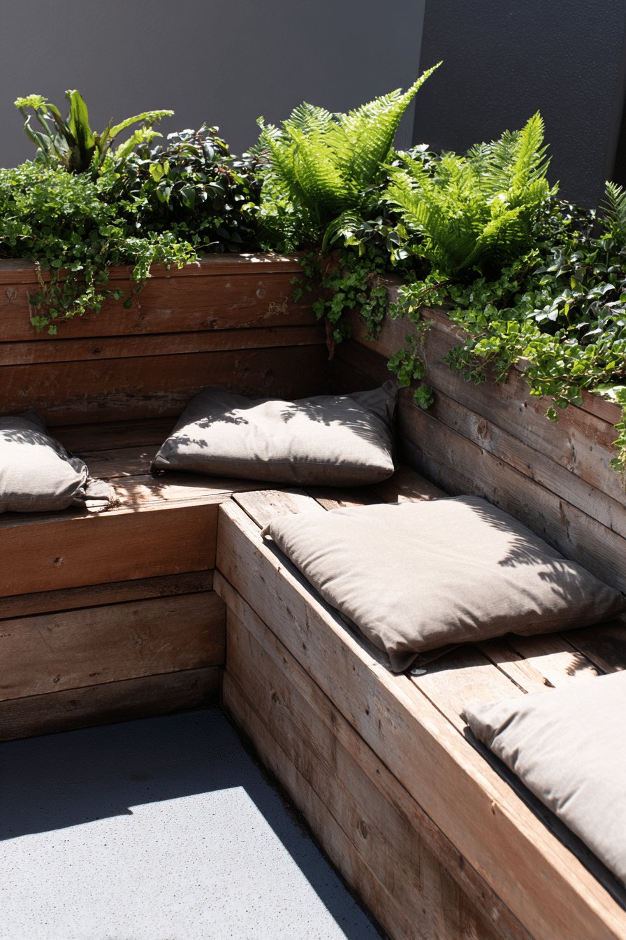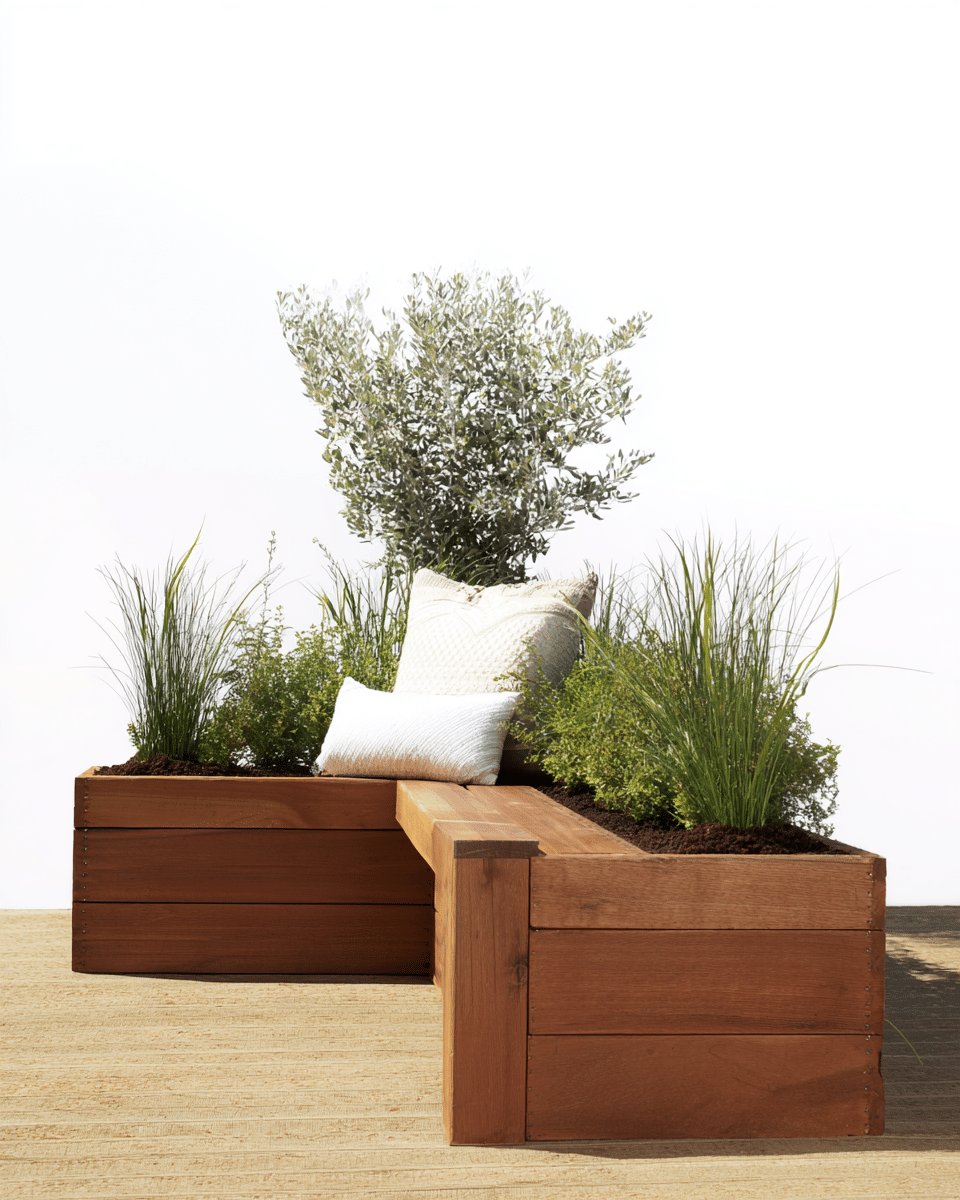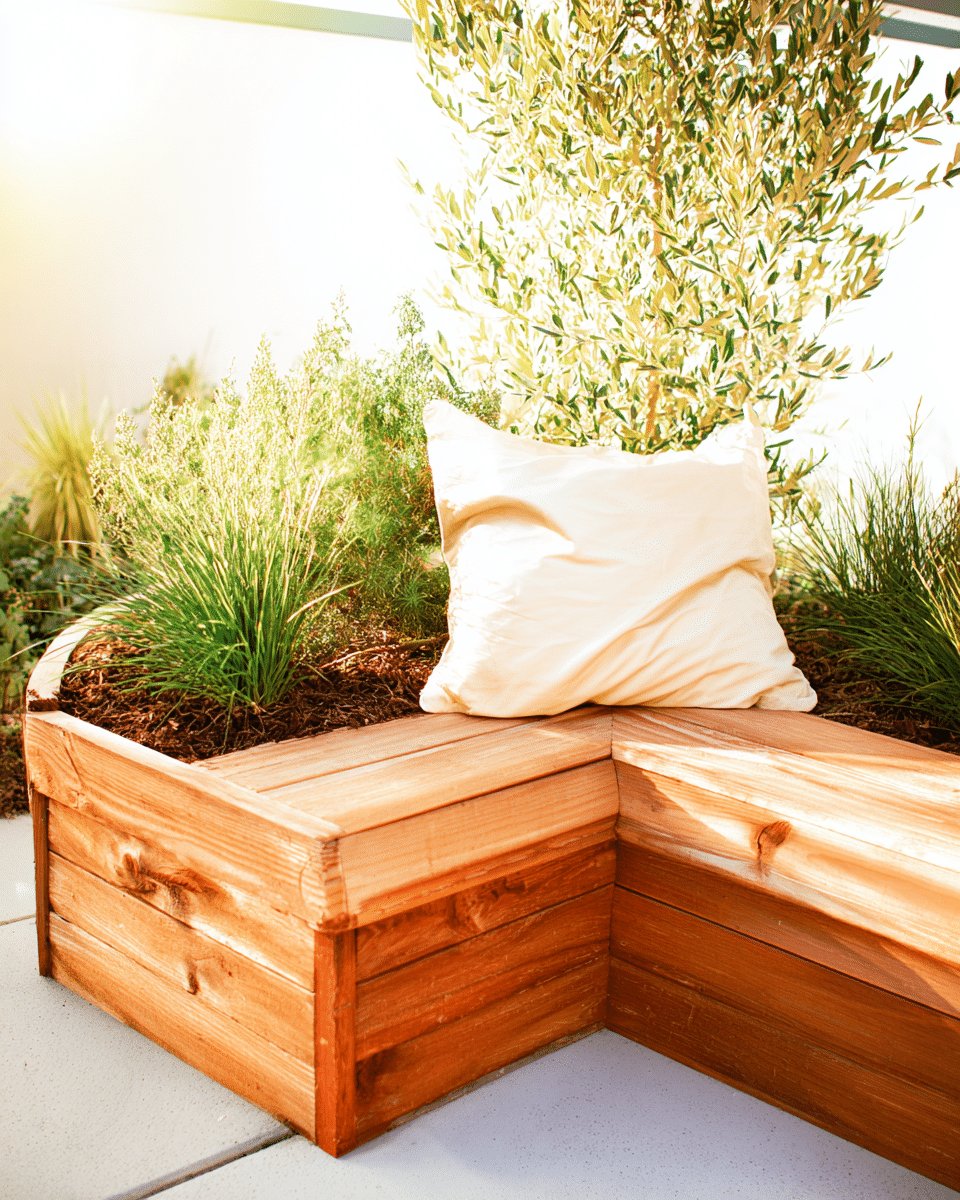 I love the easy, built-in vibe of these planter boxes with seating. The warm, honeyed wood doubles as a bench, and that crisp white cushion tucked into the corner makes it feel like someone thought about comfort and then forgot to overdo it.
