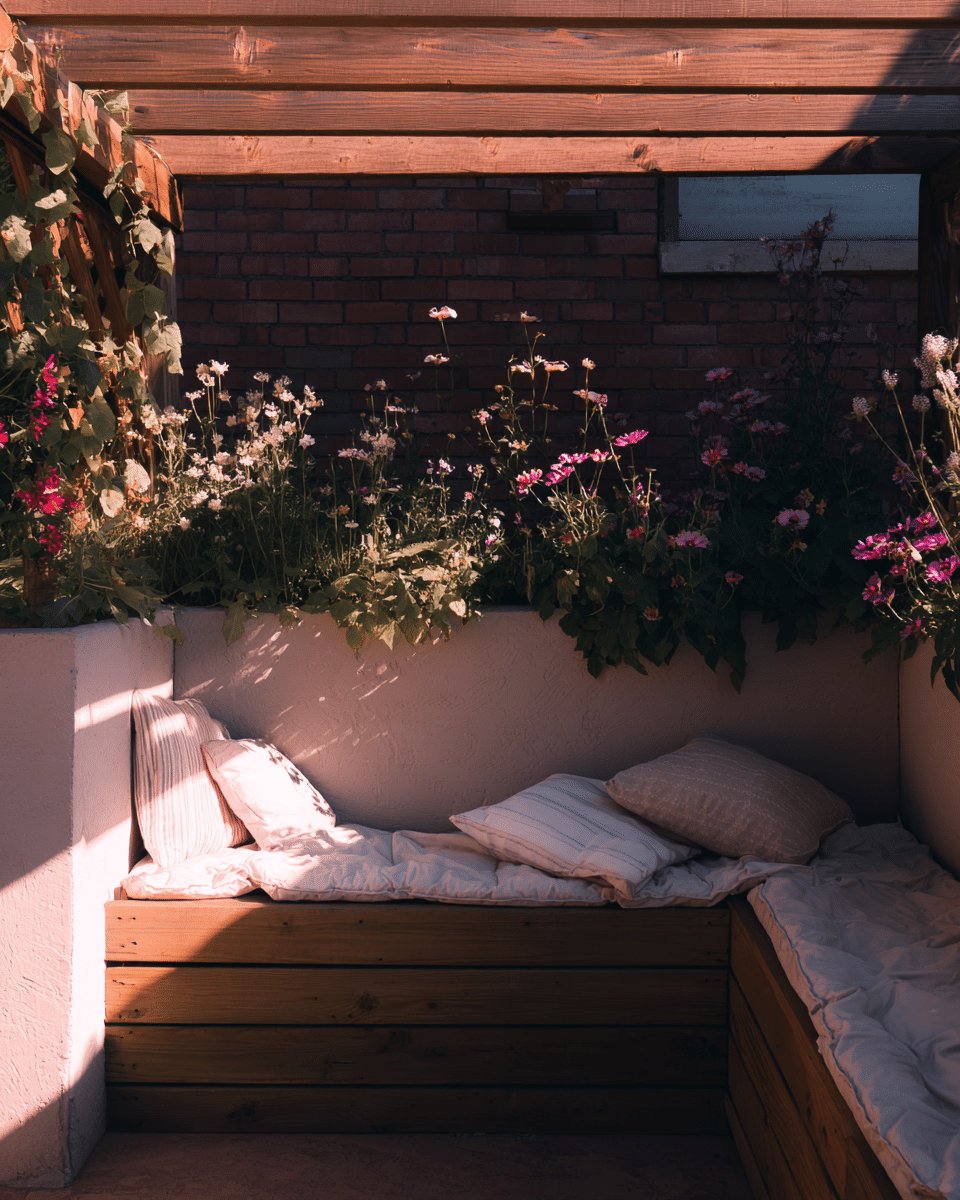 I love how the built-in bench feels like a secret little lounge, all wood slats and a pillowy cushion that begs you to linger. The planter box brimmed with airy pink blooms and soft greenery gives the whole spot a relaxed, cottagey vibe.