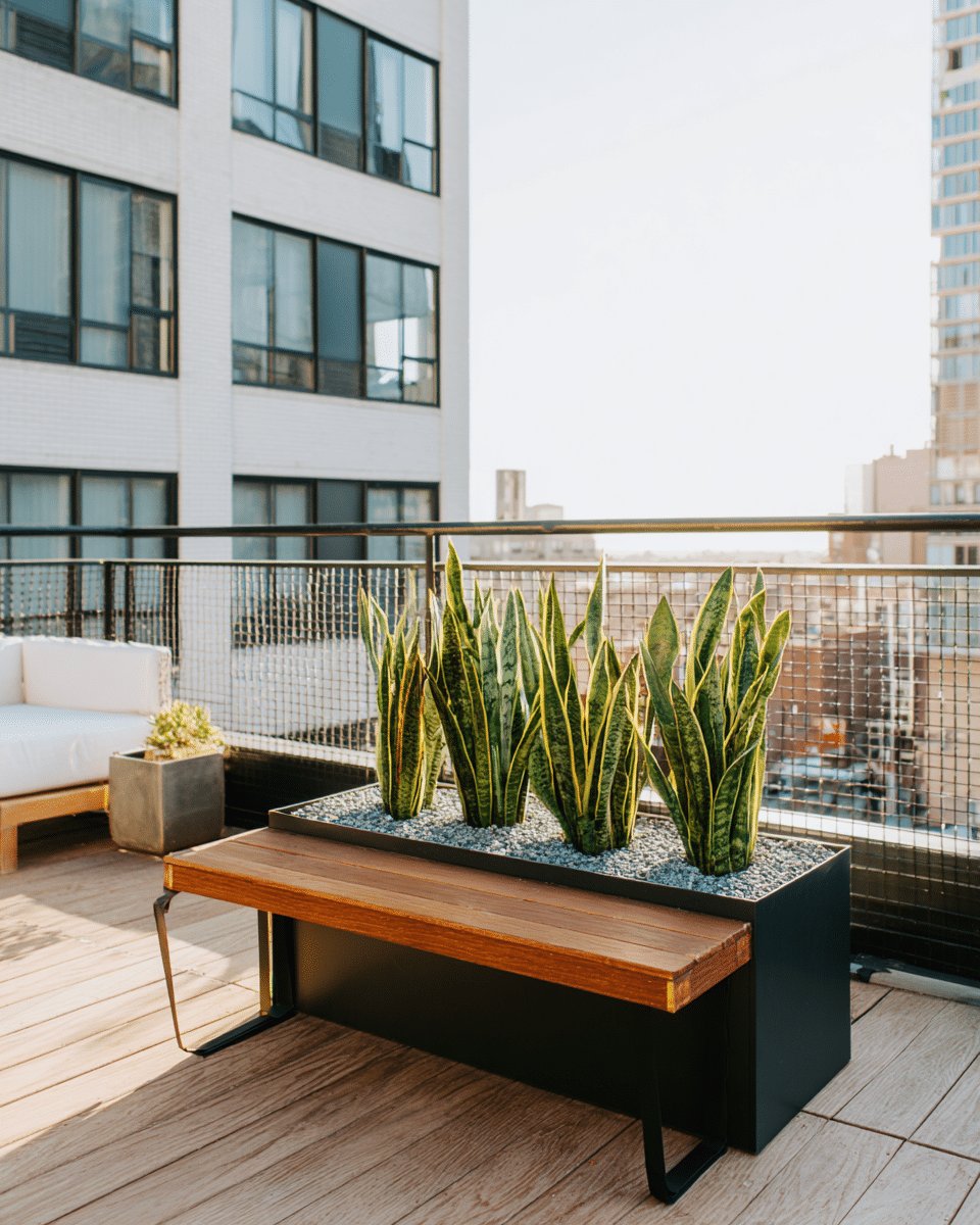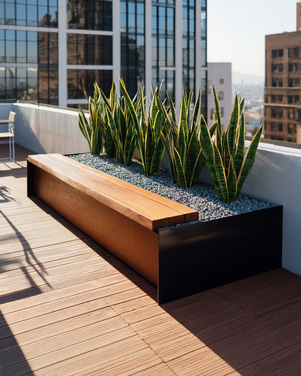 I love the calm, sculptural vibe of these planter boxes with seating. The long wooden bench reads like built-in furniture and warms up the sleek black planter, while the tall snake plants give instant privacy and architectural height.