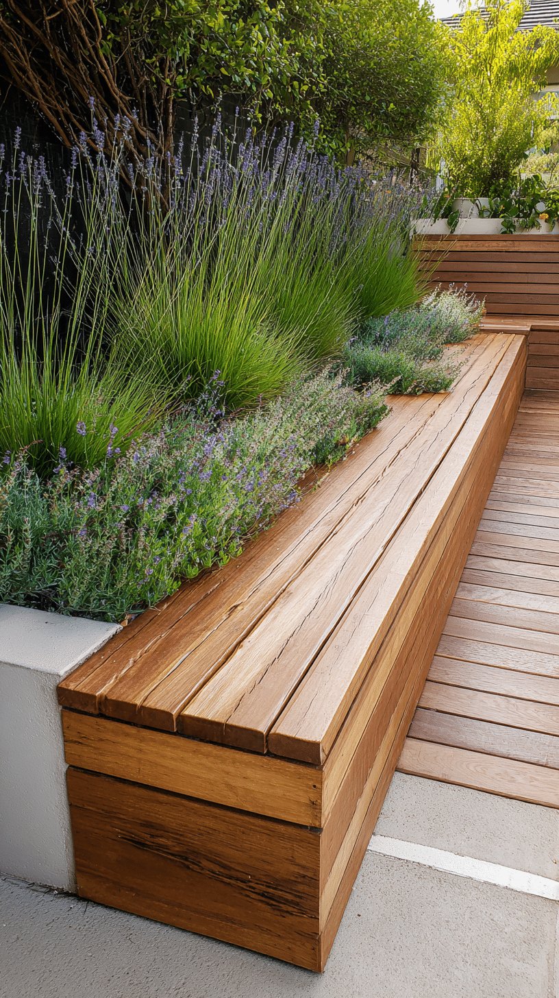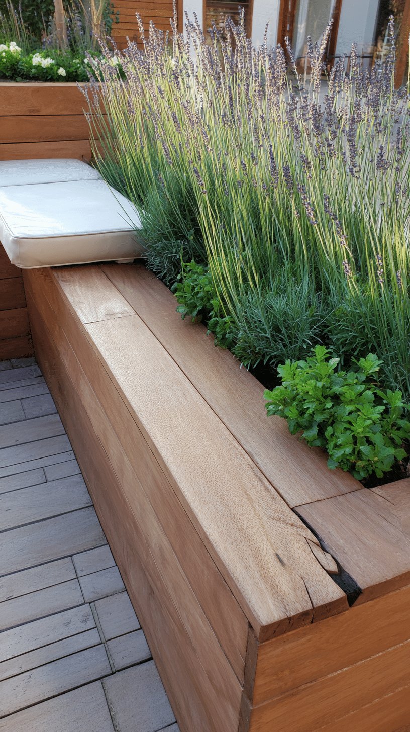 I love how the built-in bench and planter feel like furniture and garden at once. The warm honeyed wood slats read modern but cozy, while the planters are packed with tall lavender stems, feathery grasses, and low herb groundcover that softens the edges and gives off that irresistible fragrance.