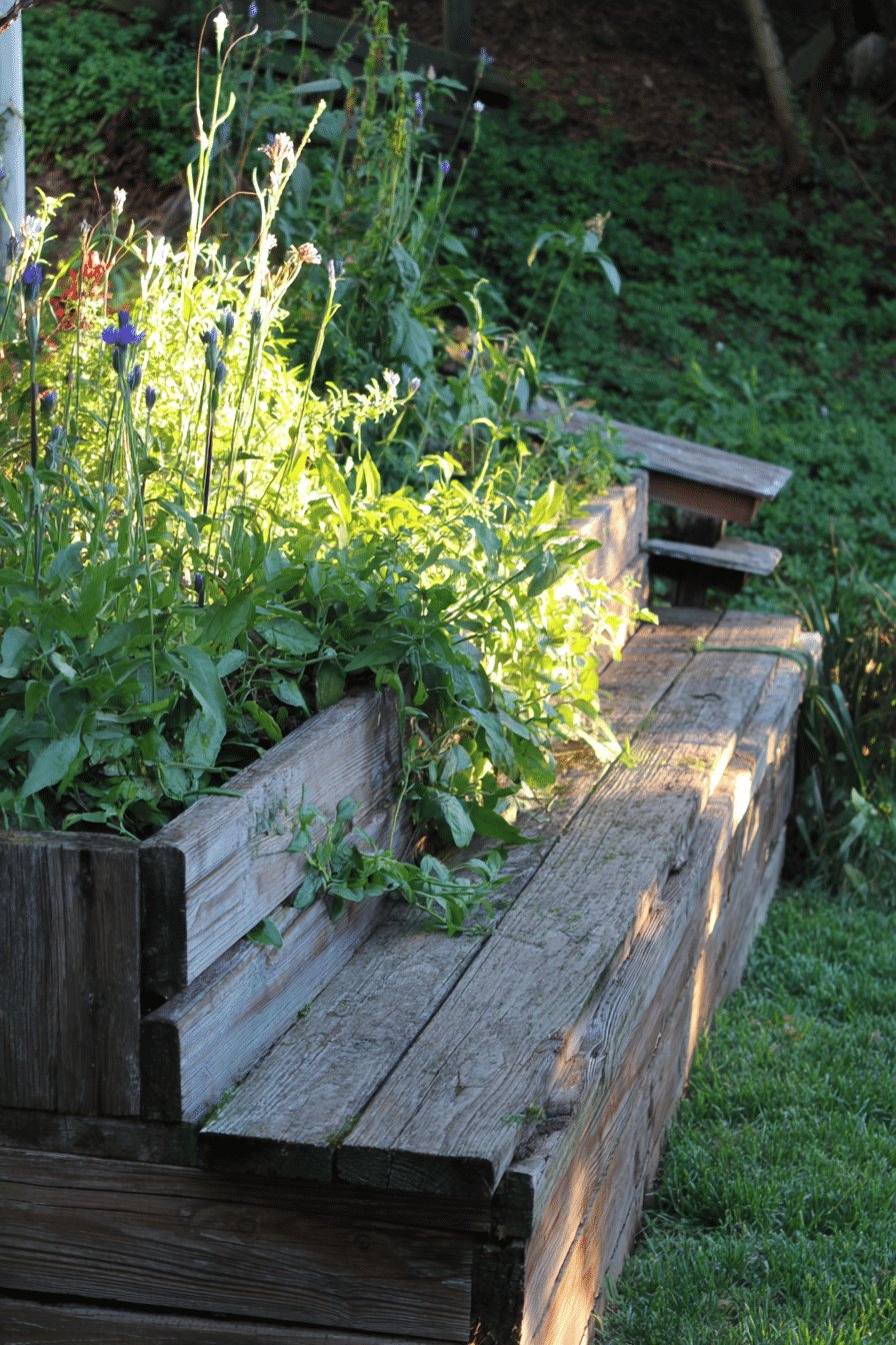 The wide tops work as seating or a spot to set a mug, and a few terracotta pots and a watering can tucked in make the whole thing feel lived in and useful. Sunlight hitting the grain of the wood gives everything that easy, golden-hour glow.