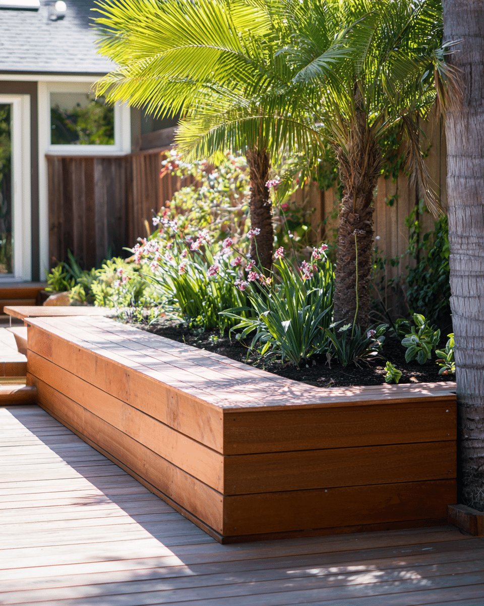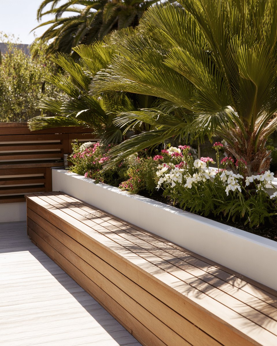 I love the built-in bench and planter combo because it reads like a mini oasis that still feels tidy. The warm, slatted wood seating pairs perfectly with the crisp white planter, and the lush palm fronds plus pops of white and pink blooms give serious vacation-vibes without trying too hard.