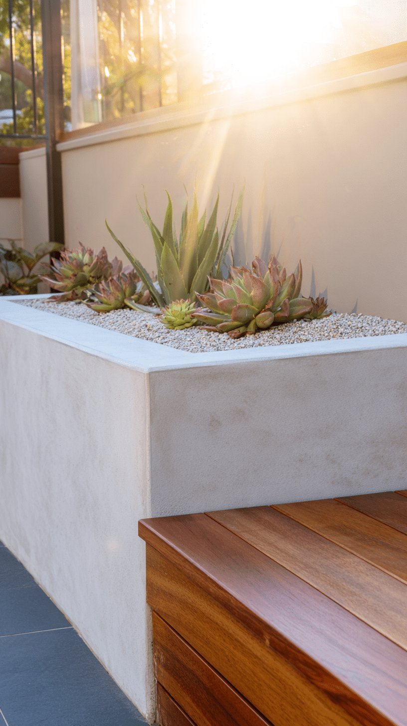 I love how the smooth, pale planter feels like a little stage for the plants. The clean stucco box and warm timber bench play so nicely together, giving me a spot to sit that actually looks intentional. Inside, spiky agave and chunky rosette succulents sit on a pale pebble topdressing for that crisp, low-water look.