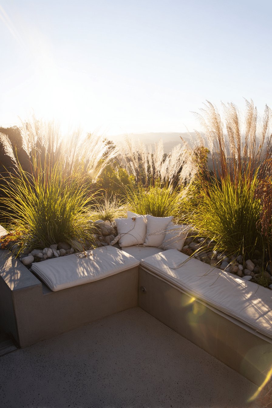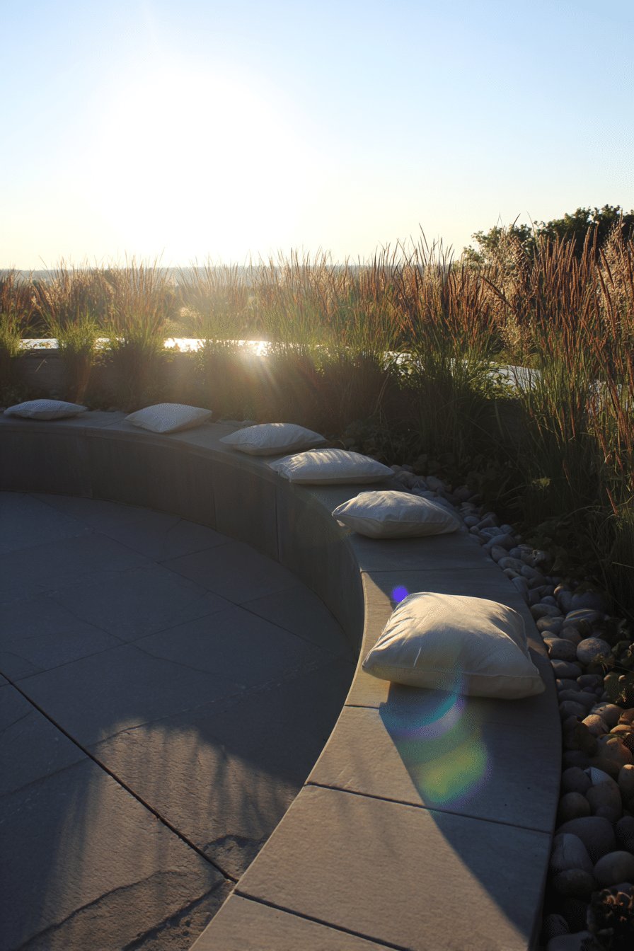 The smooth concrete bench gets softened with low, linen seat cushions and a couple of squishy pillows, while the narrow planter behind it is filled with tall, feathery ornamental grasses and a scattering of river rocks.