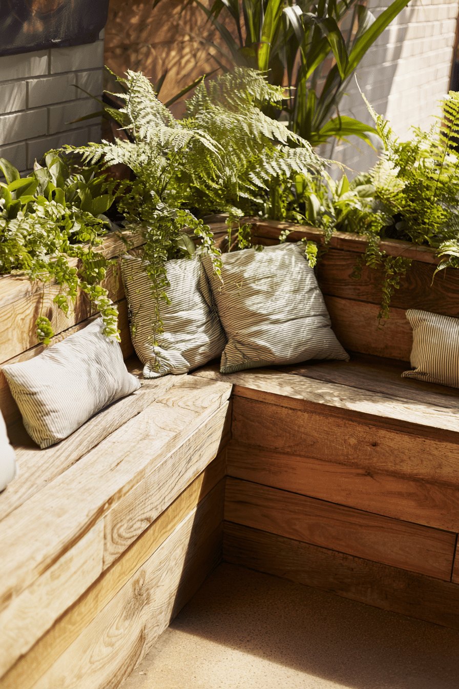 I love the warm, lived-in vibe of these planter boxes with seating. The wide, weathered wood bench tucks into built-in planters so ferns and trailing greenery spill over the back like a soft curtain. Striped, slightly rumpled cushions invite you to flop down with a coffee.