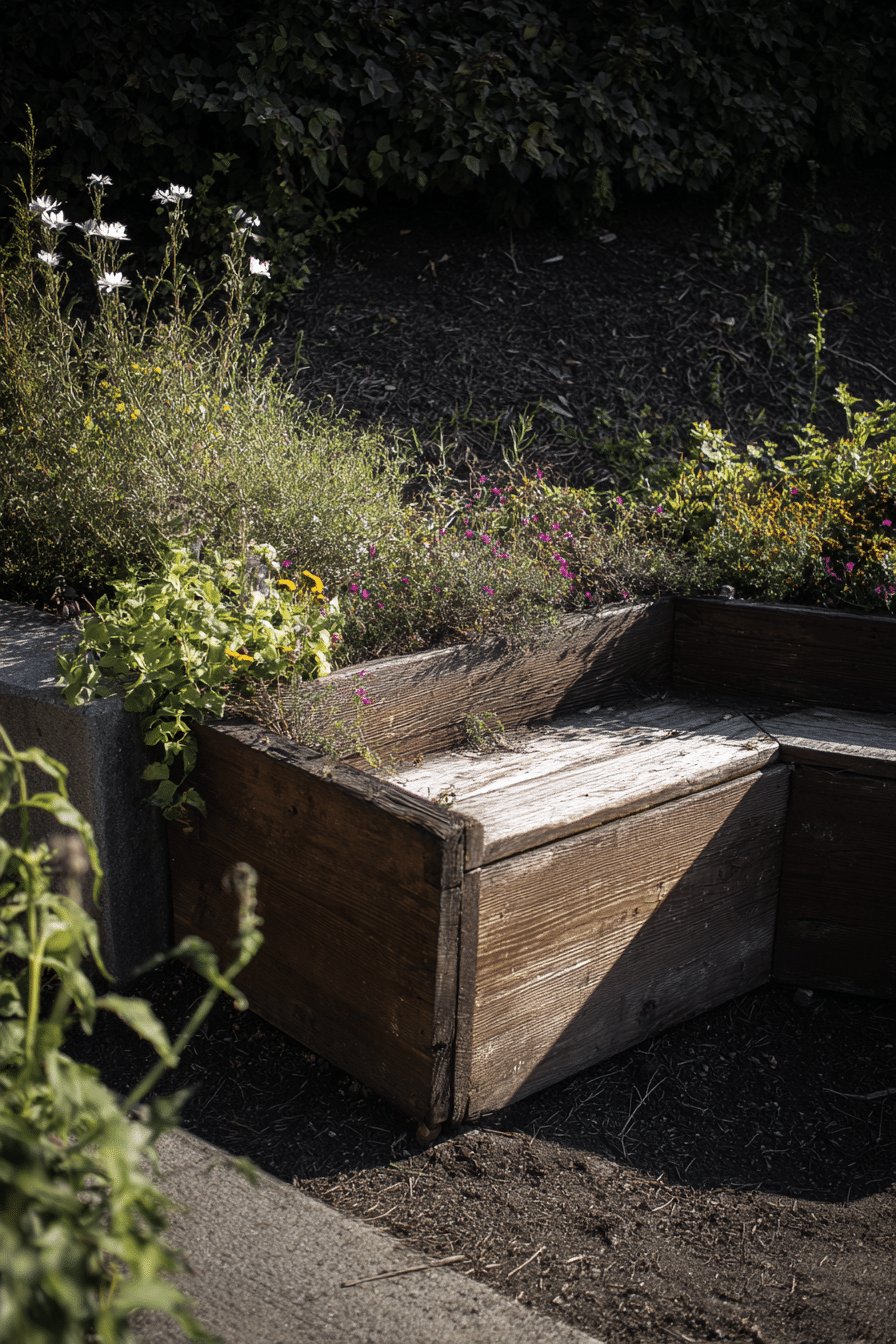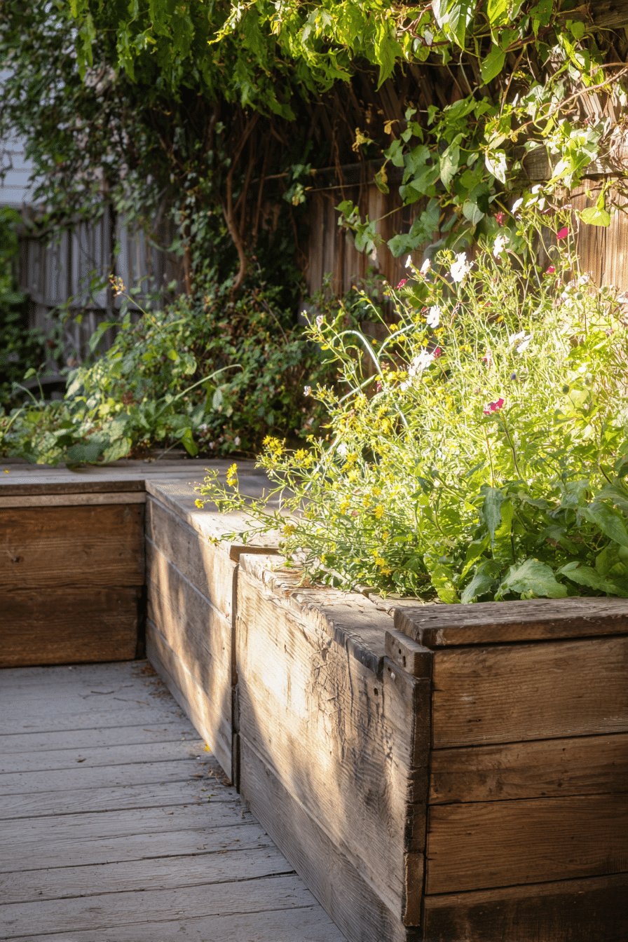 I love how these planter boxes double as bench seating; the weathered wood and built-in planters carve out a cozy corner that feels lived-in, not staged.