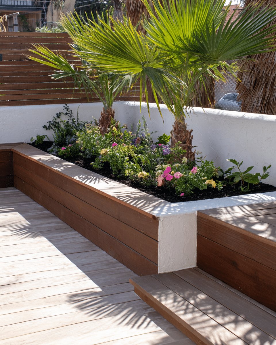 I love the built-in bench planter for how effortlessly it mixes form and function. The warm, horizontal wood seating against the crisp white planter feels modern but still cozy, and the trio of palm trunks with a low carpet of colorful annuals reads like a tiny tropical escape.